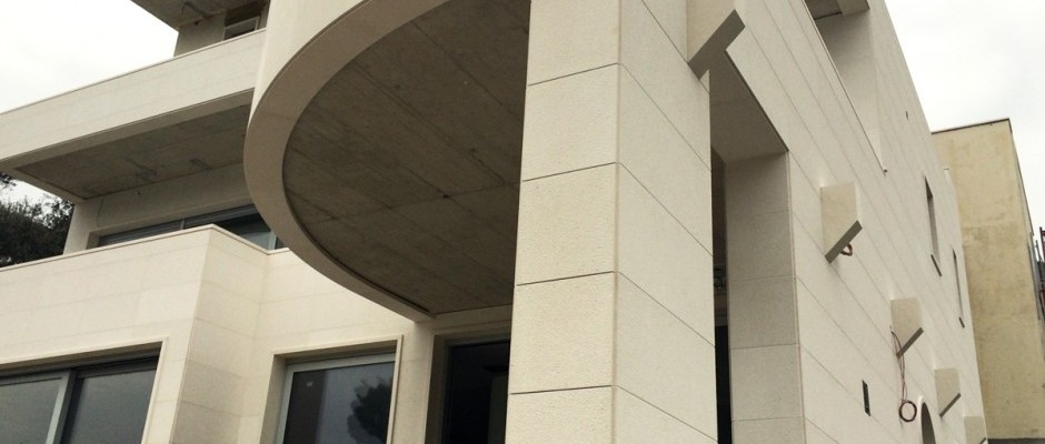 Die Steinverkleidungen der Fassade wurden mit besonderer Präzision ausgeführt, wobei klare Linien und exakte Fugen die Geometrie der Villa betonen. Auch der vollständig in Stein verkleidete Balkon trägt zur vertikalen Geschlossenheit des Gebäudes bei.