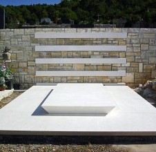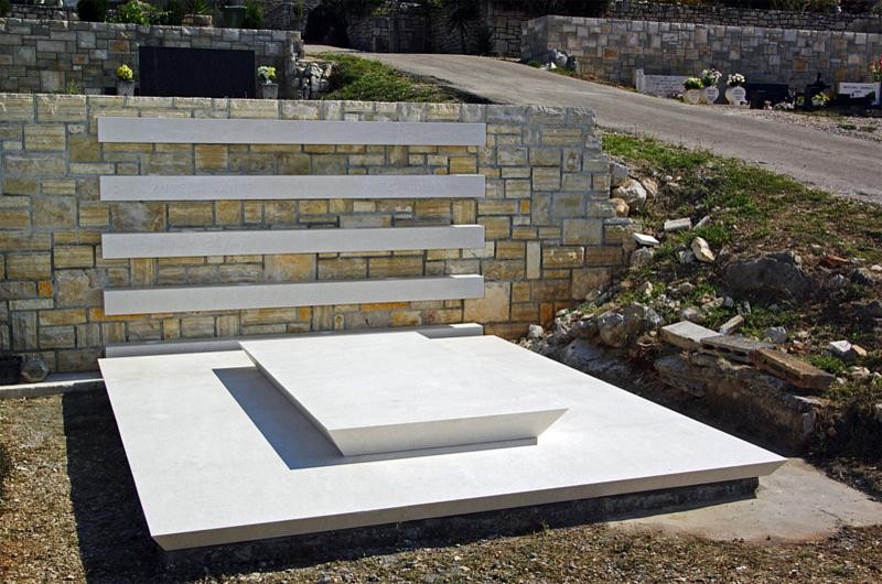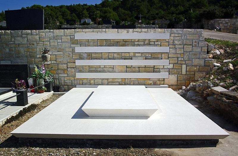 - dieses Grabmal, das sich in Vela Luka auf der Insel Korčula befindet, ist ein Beispiel für einen zeitgenössischen Ansatz in der Gestaltung von Grabmälern und Grabsteinen, bei dem Schlichtheit und Präzision ein Gefühl von Erhabenheit und Ruhe vermitteln. Das Konzept basiert auf zwei klaren Steinflächen, deren schräg geschnittene Kanten Leichtigkeit und Eleganz ausstrahlen, während sie zugleich Würde und Beständigkeit bewahren. Bei der Herstellung des Grabmals wurde besonderer Wert auf die Proportionen gelegt, um ein Gleichgewicht zwischen geometrischer Einfachheit und symbolischer Bedeutung zu erreichen. Dieses Grab aus weißem Stein strahlt Ruhe und Harmonie aus, während die sanft geneigten Flächen und klaren Linien eine subtile Aufwärtsbewegung andeuten – ein Symbol für den geistigen Aufstieg. Der Grabstein folgt derselben Gestaltungsphilosophie: minimalistisch, ausgewogen und unaufdringlich, mit einer klar definierten Fläche für Inschriften, die die Namen der Familienmitglieder tragen. Die Form wirkt durch ihre Schlichtheit und Ruhe. Die Anfertigung des Grabmals und des Grabsteins erforderte höchste handwerkliche Präzision und tiefes Wissen im Umgang mit Naturstein. Jede Linie und jede Fläche wurde sorgfältig gestaltet, um Harmonie und Bedeutung widerzuspiegeln. Dieses Grabmal entstand in Zusammenarbeit mit dem renommierten Konzeptkünstler Gorki Žuvela, dessen künstlerische Handschrift der traditionellen Grabgestaltung eine moderne, symbolische Tiefe verleiht. Das Ergebnis ist ein Werk, das Kunst, Architektur und Steinmetzkunst zu einer harmonischen und friedvollen Einheit verbindet.
