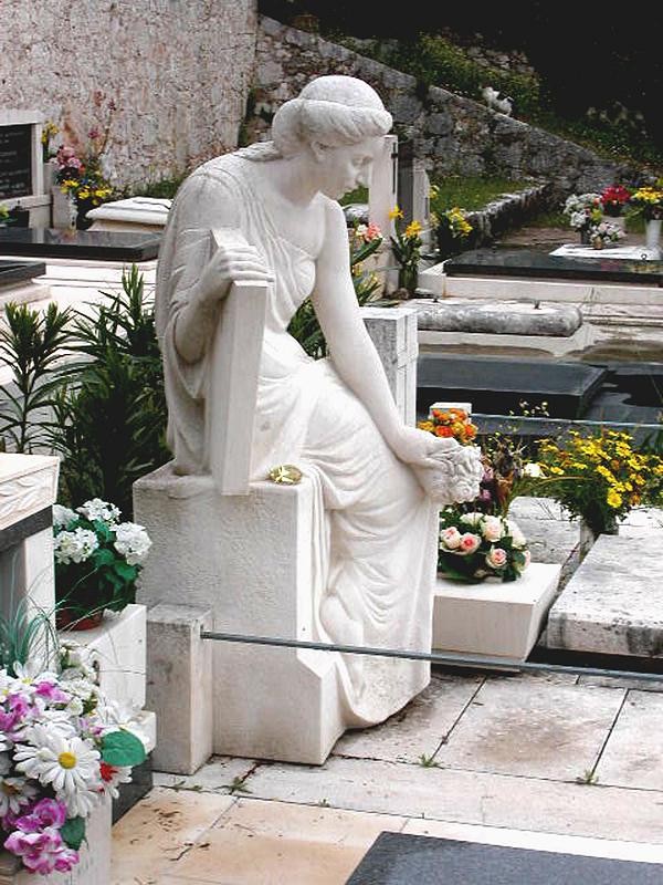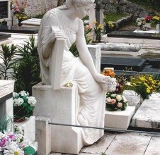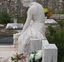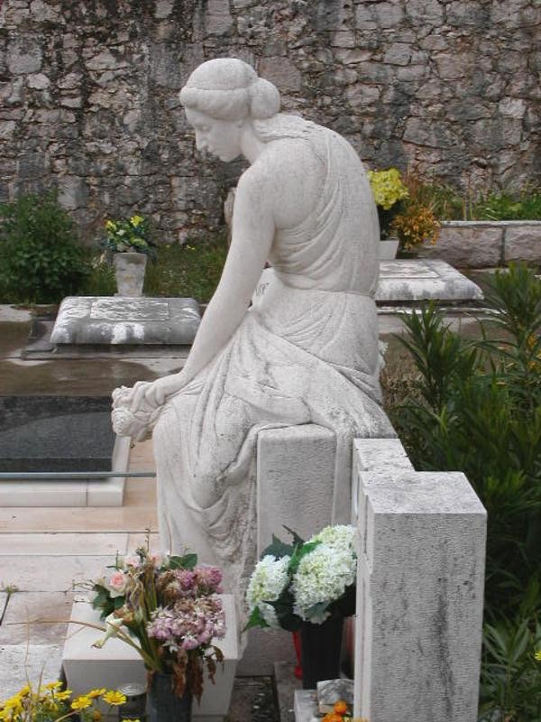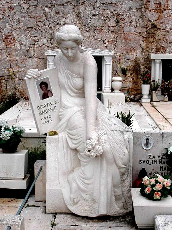 - diese Grabstätte, gefertigt aus weißem Brač-Stein, zeichnet sich durch ihre künstlerische Ausdruckskraft und tiefe Symbolik aus. Im Zentrum steht eine große Steinskulptur einer Frau, die als zentrales Element der gesamten Komposition fungiert. Die Figur steht für Trauer und Verlust und vermittelt durch ihre Haltung stille Schmerzhaftigkeit und Respekt vor einem zu früh beendeten Leben. Mit großer Liebe zum Detail gestaltet, zeigt die Skulptur eine Frau mit gesenktem Kopf, deren Ausdruck von Zurückhaltung und Würde geprägt ist. In einer Hand hält sie eine Steintafel mit dem Porträt der Verstorbenen, in der anderen ein Blumengebinde – ein zeitloses Symbol für Vergänglichkeit und Erinnerung. Die Reinheit des weißen Brač-Steins unterstreicht die emotionale Tiefe und Ruhe dieser Darstellung. Besonders bemerkenswert ist die Oberfläche der Skulptur, insbesondere die fein ausgearbeitete Steintraperie, in der die Weichheit der Bewegung und die Illusion echten Stoffes durch meisterhafte Steinbearbeitung entstehen. Dieses Spiel von Licht und Struktur verleiht der Figur Lebendigkeit, Wärme und Tiefe. In Zusammenarbeit mit dem akademischen Bildhauer Veno Jerković geschaffen, zeigt diese Skulptur für das Grabdie harmonische Verbindung von künstlerischer Sensibilität und handwerklicher Präzision. Die Balance zwischen Figur und architektonischen Elementen der Grabstätte schafft eine Atmosphäre von Ruhe und Besinnung, während das natürliche Licht die plastische Struktur des Steins betont. Die Grabstätte der Familie Makijanić ist eine Verbindung von Kunst und traditioneller Steinmetzkunst, in der jede Form eine Bedeutung trägt. Mehr als ein Grabmal, ist sie eine emotionale Hommage – eine bleibende Erinnerung, in Stein verewigt.