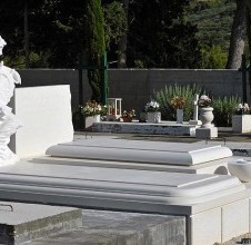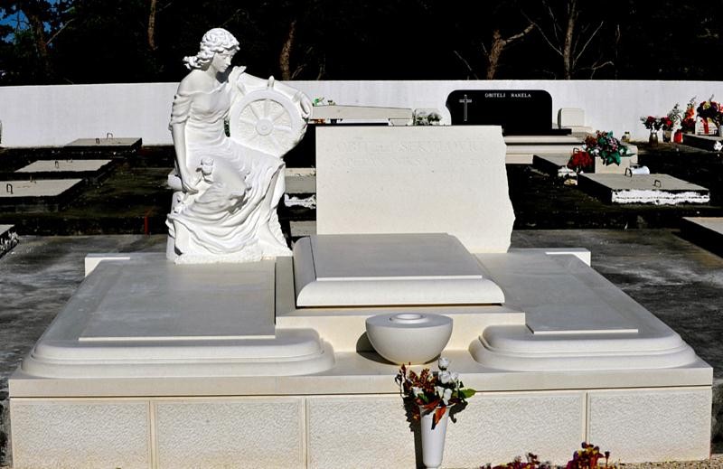 - eine der schönsten Grabstätten aus unserer Werkstatt, gefertigt aus weißem Brač-Stein, besticht durch ihre edle Struktur und künstlerische Harmonie. Diese Grabstätte der Familie Sekulović vereint meisterhafte Steinmetzarbeit mit einem ausdrucksstarken künstlerischen Ansatz, bei dem jedes Detail – von den Profilen bis zur Skulptur – handwerkliche Präzision und zeitlose Eleganz widerspiegelt. Die Basis des Grabes zeichnet sich durch reich profilierte Steinflächen aus, die ein ausgewogenes Spiel zwischen geschwungenen und geraden Linien zeigen. Diese Kombination verleiht der Anlage Monumentalität, während die feine Oberflächenbearbeitung Ruhe und Schlichtheit ausstrahlt. Das Licht gleitet sanft über den Stein und betont seine natürliche Struktur. Das dominierende Element der Komposition ist die beeindruckende Steinskulptur, geschaffen vom akademischen Bildhauer Lovre Jakšić. Sie zeigt eine junge Frau mit einem Steuerrad in der Hand, eine Allegorie der Seefahrt – Symbol für die Lebensreise und das maritime Erbe der Familie. Der Verstorbene, ein Schiffskapitän, wird symbolisch durch diese Figur dargestellt: Der geneigte Kopf drückt Trauer aus, während das im Stein gemeißelte vom Wind bewegte Haar den Geist des Meeres einfängt. Im Vordergrund befindet sich eine runde Steinvase, präzise aus demselben Stein gefertigt, die das Ensemble vollendet und die ästhetische Balance betont. Diese Grabstätte der Familie Sekulović zeigt, wie sich traditionelle Steinbearbeitung und bildhauerische Kunst in einem Werk von bleibender Schönheit vereinen. Jedes Detail – von der Form bis zur Symbolik – erzählt eine Geschichte von Leben, Reise und Erinnerung, tief verbunden mit dem Meer.