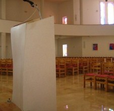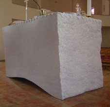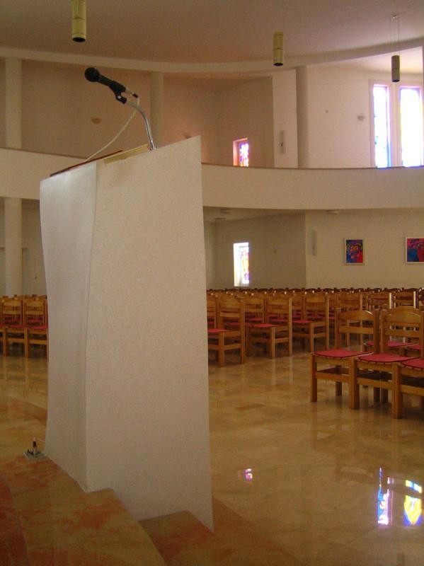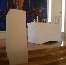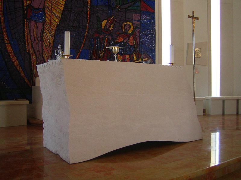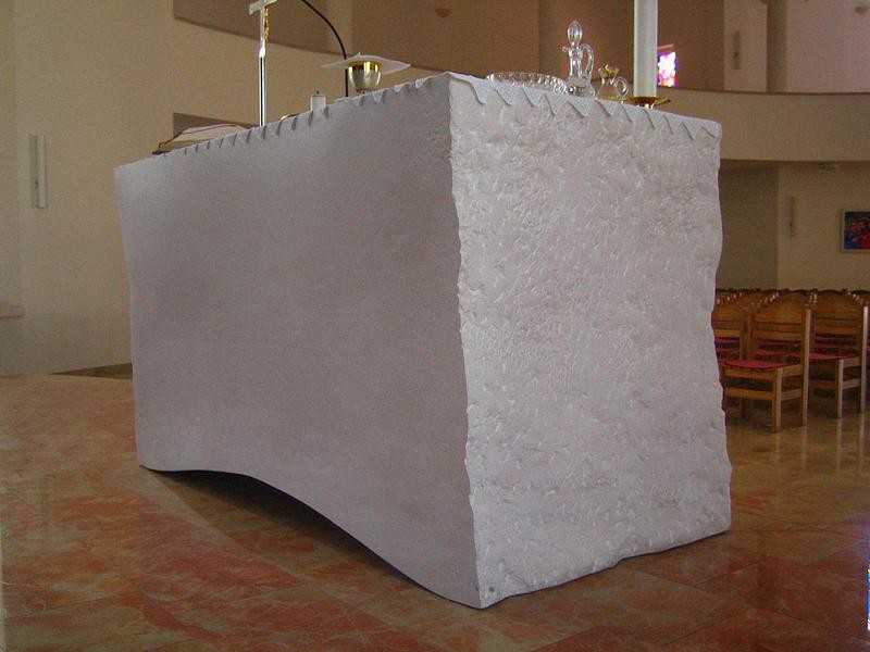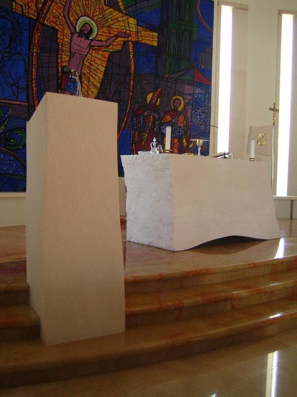 - die Innenausstattung dieser Kirche ist eine gelungene Verbindung aus zeitgenössischer Bildhauerkunst und reicher sakraler Tradition. Das Projekt wurde aus weißem Brač-Stein nach dem Entwurf eines der bedeutendsten kroatischen Bildhauer – Akademiemitglied Kuzma Kovačić – umgesetzt. Unsere Werkstatt fertigte alle Elemente an: Steinaltar, Ambo und Tabernakel, wobei wir die künstlerische Vision freier Formen im Raum respektierten, im Gegensatz zu strengen geometrischen Linien. Alle Steinelemente sind so geformt, dass sie wie natürliche, fast unberührte Blöcke wirken – mit deutlich erkennbarem Handschrift des Bildhauers. Die Oberflächen sind unterschiedlich stark bossiert – teils kräftiger, teils feiner – wodurch ein lebendiges Spiel aus Licht und Schatten sowie zusätzliche Tiefe im Material entsteht. Der Steinaltar zieht mit seiner Form besonders die Aufmerksamkeit auf sich. Die obere Fläche ist für liturgische Zwecke präzise bearbeitet und geglättet, während die Seiten eine kraftvolle Reliefstruktur aufweisen. Auf der Vorderseite ist ein dezent eingraviertes Kreuz zu sehen – nicht dominant, sondern subtil aus dem Volumen des Steins hervortretend wie ein offengelegtes Glaubenssymbol. Der Ambo folgt derselben bildhauerischen Logik – eine freistehende Form mit sanft geschwungenen Linien, die monolithisch und zugleich elegant wirkt, in Harmonie mit dem Kirchenraum. Der Tabernakel ist besonders beeindruckend – gefertigt aus einem einzigen Steinblock mit unregelmäßigen Kanten, die an ein Tuch erinnern. Diese Anspielung auf das Schweißtuch der Veronika verleiht ihm eine tiefere symbolische Bedeutung. In der Mitte befindet sich ein Bronzeteil, das als Tür dient und sorgfältig eingepasst wurde, um den Aufbewahrungsraum für die Hostien zu schützen. Dieses Projekt aus dem Bereich sakraler Objekte zeigt, wie moderner Steindesign in Einklang mit liturgischer Symbolik gebracht werden kann, wobei die Spiritualität des Raums und des Materials gewahrt bleibt. Weißer Brač-Stein in Verbindung mit meisterhafter Ausführung wird so zum kraftvollen Ausdrucksmittel zwischen Kunst und Glaube.