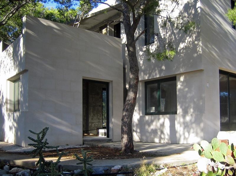 - zwischen den Pinienwäldern von Milna auf der Insel Brač erhebt sich ein modernes Steinhaus, das Architektur, Natur und Material in vollkommener Harmonie vereint. Entworfen vom Architekten Vinko Peračić, strahlt das Projekt Klarheit, Eleganz und Ruhe aus – eine zeitgenössische Interpretation der dalmatinischen Steintradition. Alle Steinarbeiten wurden in unserer Werkstatt unter der Leitung von Dražen Jakšić ausgeführt – von der Vorbereitung über die handwerkliche Bearbeitung bis hin zur präzisen Montage. Das Ergebnis ist eine perfekte Verbindung von Naturstein für Innen- und Außenbereiche, die Handwerkskunst und moderne Architektur miteinander verschmilzt. Die Steinfassade aus weißem Brač-Stein bestimmt das äußere Erscheinungsbild des Hauses. Ihre fein gerillte Oberfläche erzeugt eine sanfte Bewegung und ein faszinierendes Spiel aus Licht und Schatten, das sich mit dem Sonnenstand und den umgebenden Bäumen verändert. Die Architektur ist klar, reduziert und von minimalistischer Schönheit – der Stein selbst ist das zentrale gestalterische Element. Ein besonderes Detail des Außenraums ist eine Steinsäule, die mit derselben Technik gefertigt wurde wie die Fassade. In ihre Oberfläche ist die Hand des Sohns des Besitzers eingraviert – ein emotionales, persönliches Zeichen, das Zugehörigkeit und Beständigkeit symbolisiert. Das Relief wurde vom akademischen Bildhauer Lovre Jakšić gestaltet und verleiht dem Objekt eine künstlerische Tiefe. Im Inneren setzen Steindetails im Interieur die gleiche ruhige und edle Sprache fort. Stein für Villen und Häuser wird hier nicht nur als Baumaterial, sondern als Ausdruck von Identität und Beständigkeit eingesetzt. Diese Villa in Milna zeigt, wie eine Steinfassade mit klaren Linien und natürlicher Textur die Essenz moderner mediterraner Architektur verkörpern kann.