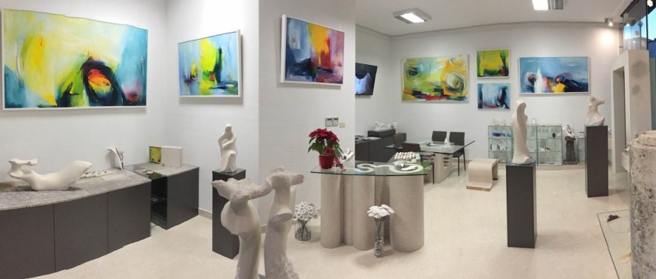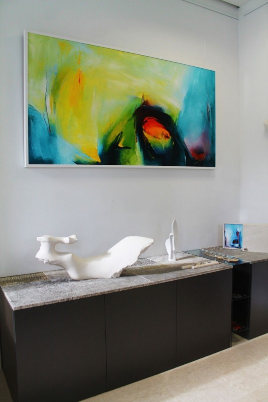 A dedicated area showcases artworks by Doctor of Arts Dina Jakšić, whose vibrant colours and abstract compositions have become a signature of the gallery.