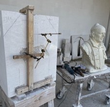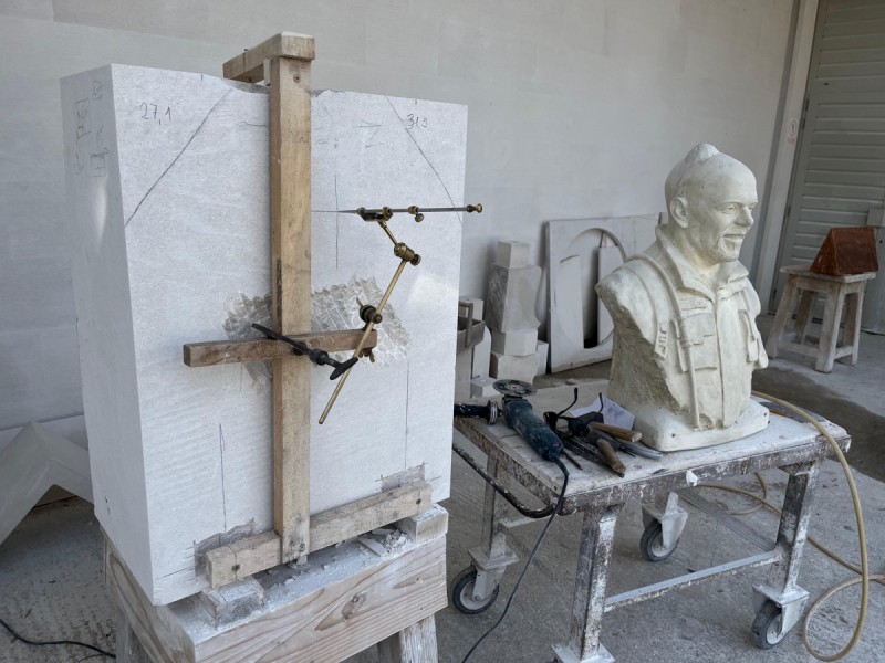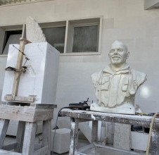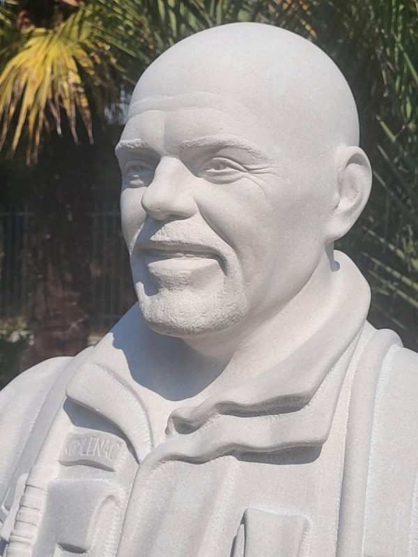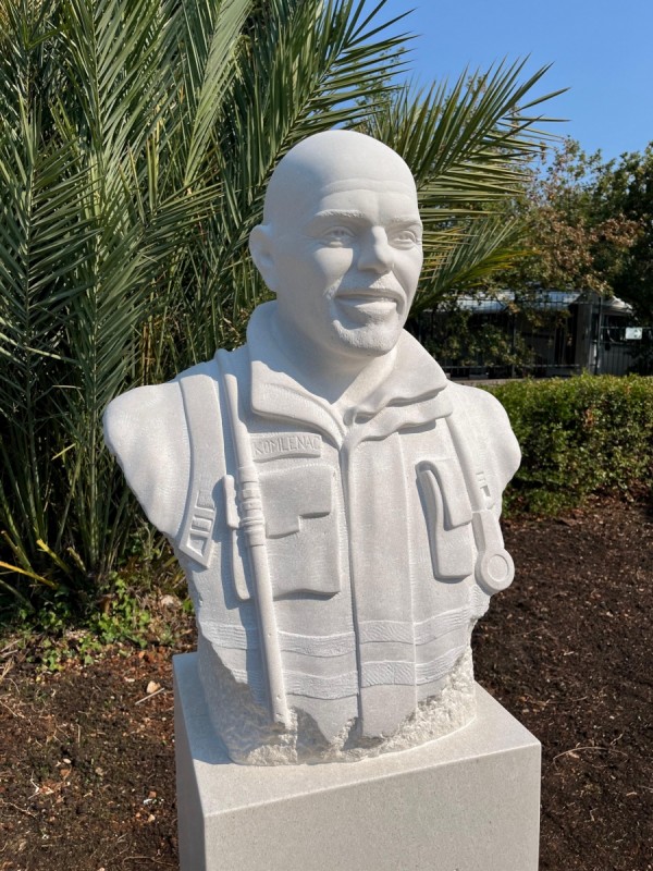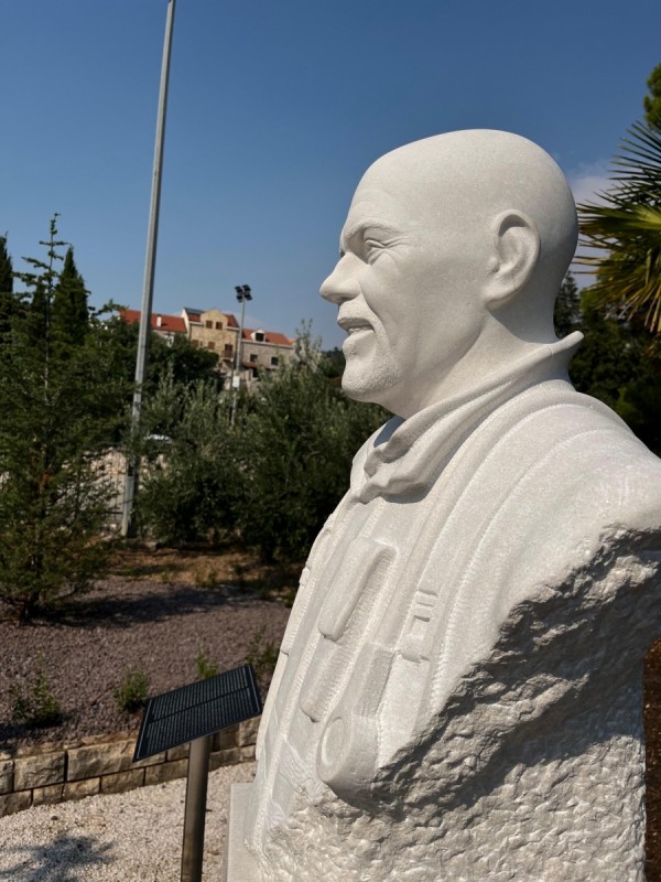 - the bust of firefighter Goran Komlenac is a portrait sculpture crafted from white Brač stone and mounted in the park of Antun Masle Primary School in Orašac, near Dubrovnik. It is one of the many monumental works by our academic sculptor Lovre Jakšić for public spaces. The creation of this stone bust followed a meticulous sculptural process. It began with a clay model sculpted in life-size proportions, capturing the subject’s likeness with great attention. From the clay, a plaster mould was created, followed by a plaster model used as a reference for stone carving. Using the traditional pointing technique, every detail of the portrait was transferred from plaster to Brač stone, resulting in a faithful and expressive portrait in stone. This portait sculpture is remarkable for the detailed rendering of the firefighter’s uniform, equipment, and facial expression – a calm and determined look that reflects the dignity of the man it commemorates. The spomenik is mounted on a solid stone pedestal, also crafted from white Brač stone, harmoniously integrated into the landscaped setting of the school park. This stone sculpture is not only a work of art but a permanent symbol of respect – a spomenik in white Brač stone dedicated to a hero.