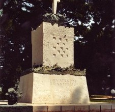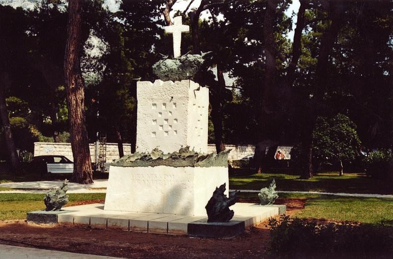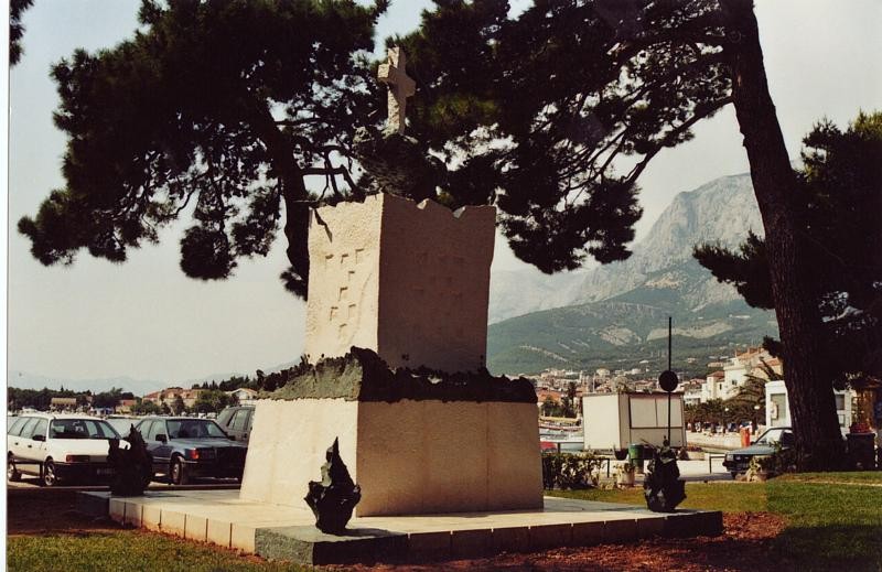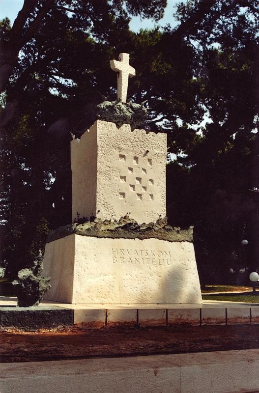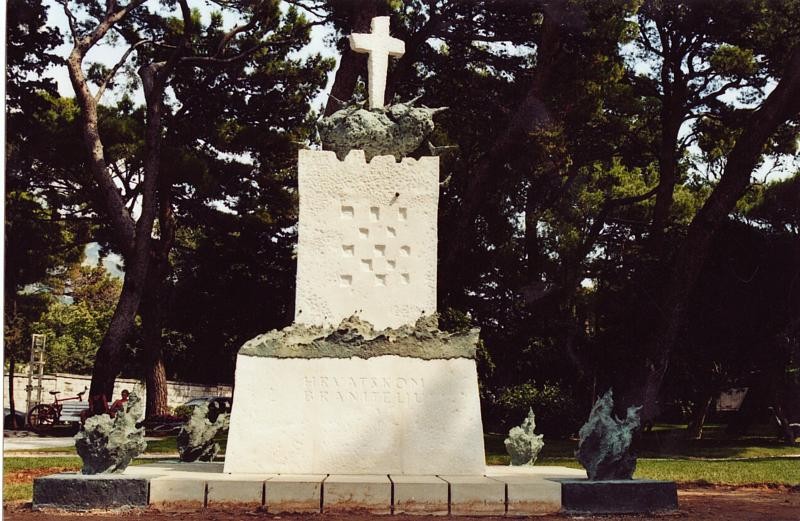 - the creation and installation of the monument to the Croatian defenders in Makarska is one of the most demanding and significant projects completed by our workshop in the field of monuments, sculpture and public spaces. This monument to the defenders, made according to the scale model by the academic sculptor Kuzma Kovačić, was at the time of its installation the central monument to the defenders for the entire Dalmatian region, giving it strong symbolic and memorial importance. The process of creating the monument from the model was extremely challenging due to its size and complexity. The monument is made from two monumental blocks of stone, carefully selected and shaped in our workshop. Each block has a slightly irregular geometric form, giving the entire composition a dynamic and monumental presence. The stone surface is hand-carved, with special attention to textures and transitions. The forms are not fully realistic; instead, they appear to emerge softly from the stone itself, adding a sculptural depth and spiritual dimension. The central motif is the stylised Croatian chequerboard, whose elements blend gently into the stone surface, symbolising tradition, identity, and the sacrifice of Croatian defenders. In addition to stone, the monument includes bronze elements, creating a harmonious relationship between the materials and reinforcing the artistic value of the original concept. The installation of the monument was particularly demanding. Due to the enormous weight and size of the stone blocks, the largest cranes available at the time had to be used. The logistics required great precision, and even part of the surrounding trees had to be temporarily removed to allow the blocks to be safely lowered into position. Our workshop led the entire installation process, ensuring perfect structural stability and aesthetic coherence. The ceremonial unveiling of the monument to the Croatian defenders in Makarska was a significant event for the city and the wider region. The monument became a place of remembrance, respect and gathering, as well as a clear example of how creating a monument from a scale model can result in a powerful work of public sculpture. This project represents a strong union of craftsmanship, art and honour, and remains one of the most representative examples of our workshop’s work on major public monuments.