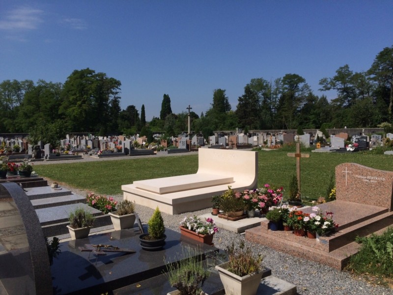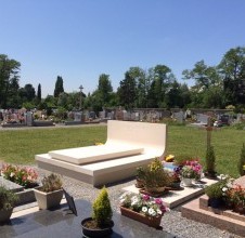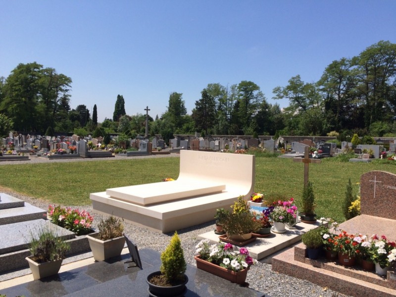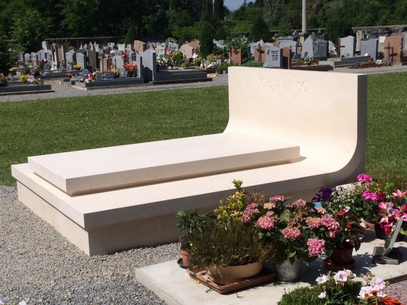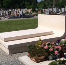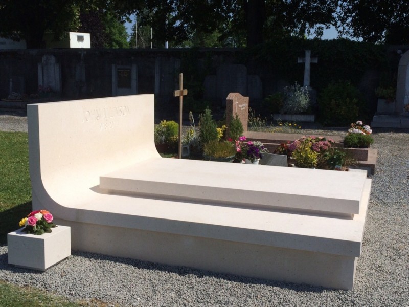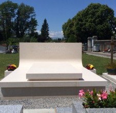 - this elegant tomb made of white Brač stone is located in a peaceful French cemetery, where its brightness and simplicity stand out among the darker granite monuments that dominate the surroundings. The design is by Dražen Jakšić, realised as an example of contemporary stone artistry that bridges Mediterranean tradition and European context. The entire tomb is conceived as a single stone composition – clean, precise lines and a softly curved back surface create a sense of fluidity within a monumental form. The stone is finely finished with a matte surface that highlights its natural texture and tone. The central element, a minimalist gravestone, rests on a solid base and gently rises towards the back, where the family name is carved into the upright slab. Within the French cemetery landscape, this tomb clearly stands out as an example of Croatian craftsmanship and Brač stone aesthetics. While dark granite monuments convey coldness and rigidity, white Brač stone brings light, purity and serenity. Its soft reflection of sunlight adds warmth and sophistication while preserving a sense of dignity and permanence. This project also represents an important aspect of Croatian stone export, reaffirming its reputation across Europe. Brač stone has long been admired in architecture and sculpture, and works such as this one demonstrate its timeless quality and expressive power. The Allinson family tomb symbolises the union of tradition, contemporary design and masterful stonemasonry — where simplicity transforms into elegance and white stone becomes a bearer of light and peace.