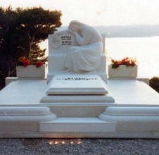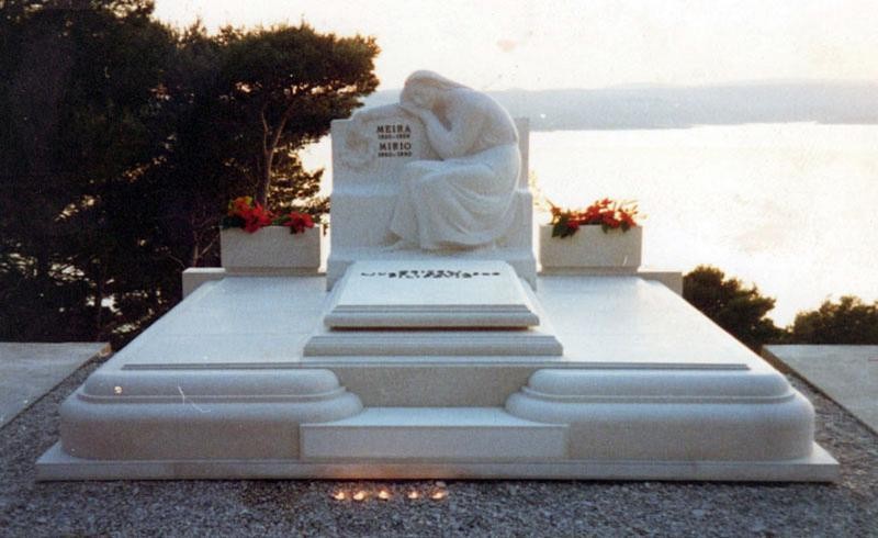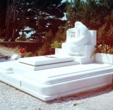 - this tomb made of white Brač stone is an exceptional example of sculptural and stonemasonry craftsmanship, where the creation of a tomb and headstone design merge into a harmonious and striking whole. Seemingly simple in structure yet rich in detail, the tomb radiates monumentality and refined aesthetics. At its centre stands a stone sculpture of a girl leaning against the headstone. Her posture – bowed head and hand gently holding a flower wreath – expresses sorrow, remembrance, and silence. The sculpture is crafted with an extraordinary sense of volume and proportion; in every movement and fold of the stone drapery, one can sense emotional depth and sculptural precision. The statue was created in collaboration with academic sculptor Veno Jerković, adding further artistic value to the entire project. The composition is based on a balance between curved and straight lines. The dominant soft forms give the tomb a sense of serenity, while clean horizontal surfaces bring architectural clarity. The richly profiled edges at the front, executed in several levels, enhance the elegance and emphasise the light reflections on the stone’s surface. On both sides of the sculpture, two symmetrical stone vases frame the composition. More than decoration, they are an integral part of the architectural rhythm – the flowers emerging from them symbolise life and continuity between past and present. This tomb with a stone figure exemplifies how stone craftsmanship and contemporary sculpture can unite in a timeless work of art. Every detail – from the profiles to the sculpture itself – reflects devotion to material, respect for tradition, and a profound emotional presence that makes this memorial truly unique.