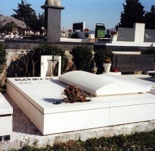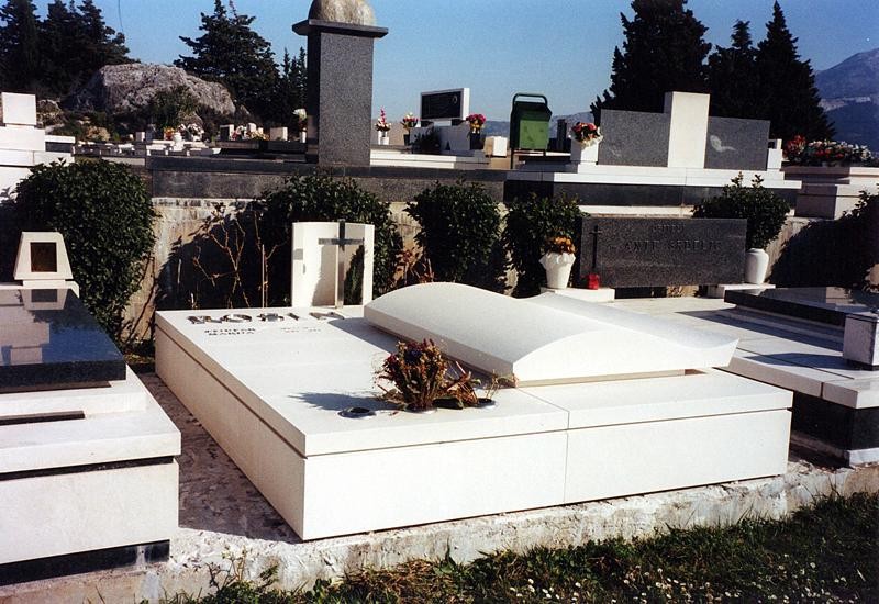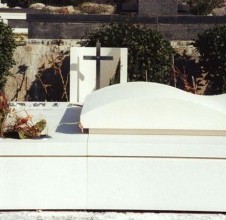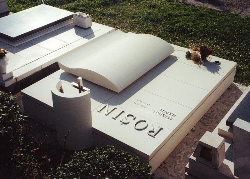 - this tomb in Milna is a remarkable example of collaboration between architect Jerko Rošin and the Jakšić stonemasonry workshop, where architectural precision meets refined craftsmanship and artistic sensibility. The design combines the simplicity of modern form with the timeless strength of traditional white Brač stone. The central element of the composition is the gently curved tombstone, whose soft contour introduces fluidity into the otherwise geometric structure. This subtle wave of stone creates a sense of rhythm and balance, while the play of light across the surface enhances the purity and warmth of the material. A striking feature of this modern tomb is the stainless-steel cross, whose polished surface contrasts beautifully with the matte texture of the stone. The cross is positioned before a semicircular stone element, creating visual depth and stability. This combination of stone and metal symbolically reflects the connection between permanence and light, earth and sky. In the lower section, built-in vases form another distinctive detail. Here, the flowers seem to emerge directly from the stone, creating an organic unity between architecture and nature. This refined solution adds a feeling of harmony and serenity to the overall composition. Through its clean lines, precise proportions, and thoughtful material balance, the Rošin Family Tomb conveys modern elegance and spiritual symbolism. Every element – from the shape of the stone to the cross and integrated vases – contributes to a composition that embodies peace, dignity, and eternity.