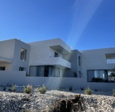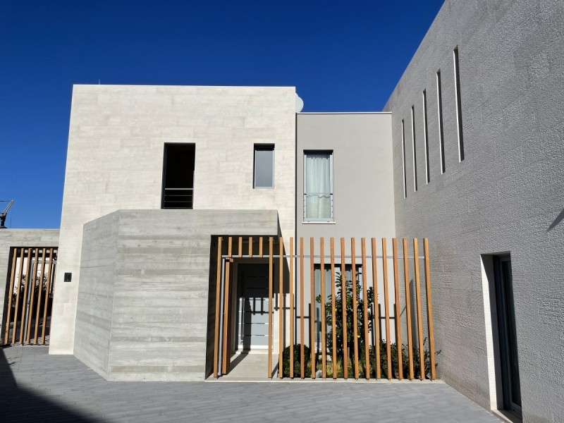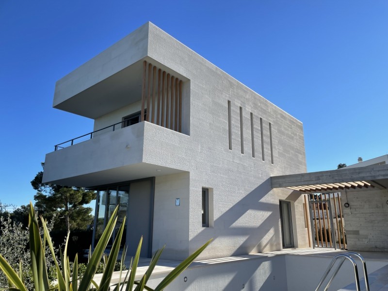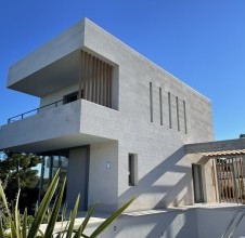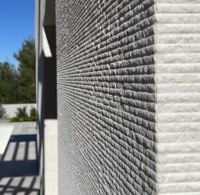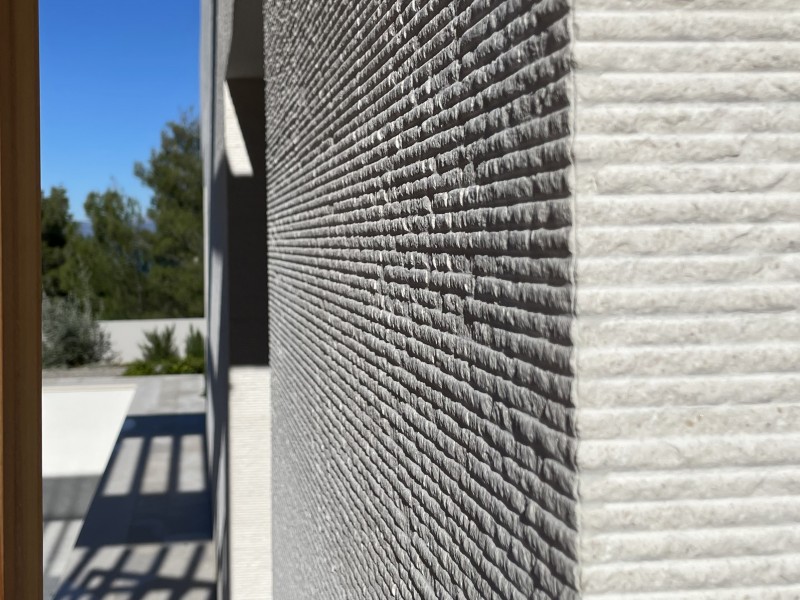 - a stone facade is more than just a protective layer – it is a statement of style, durability, and refined living. Especially when crafted from white Brač stone for facades, whose natural brightness and texture bring timeless elegance and sophistication to contemporary architecture. A prime example of this is the modern villa in Sutivan, designed by architect Sanja Koren Veljačić. The villa stands out for its unique grooved stone facade, an original product of our workshop. The stone surface features lines carved in such a way that a gentle ridge and recess are formed, giving it a distinctive relief and tactile depth. The process itself is intentionally coarser, creating a surface with a natural, handcrafted texture that comes alive through the play of light and shadow. Under strong sunlight, depending on the angle of the rays, the lines appear more pronounced and defined, while at dawn or dusk they almost disappear – the facade changes throughout the day, reflecting the rhythm of light and time. Our workshop is renowned for its exceptional precision in stone joint work, crucial for achieving the seamless continuation of lines across the entire facade. Every joint is perfectly aligned, forming a harmonious, unified composition. This precision is especially evident at the villa’s corners, where the stone plates meet flawlessly, creating a sculptural sense of perfection. Such craftsmanship earned us an award for excellence in modern stone facade design. In addition to the stone facade, our team executed all other stonemasonry works throughout the villa – from stone staircases and interior details to exterior surfaces that connect the architecture with its Mediterranean surroundings. Thanks to the white Brač stone for facades, the villa in Sutivan gained a distinctive identity and significantly increased in value. This project demonstrates how tradition and modern design can coexist in perfect balance, creating architecture that truly breathes with its environment.