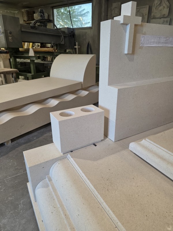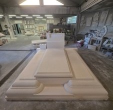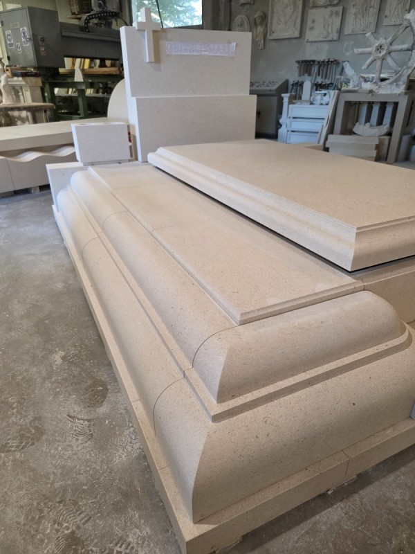 U našoj klesarskoj radionici u tijeku je izrada grobnice od bijelog bračkog kamena namijenjene za Mirogoj u Zagrebu. Riječ je o projektu koji pokazuje svu ljepotu i preciznost oblikovanja kamena, od prvog reza do završnog profila.
