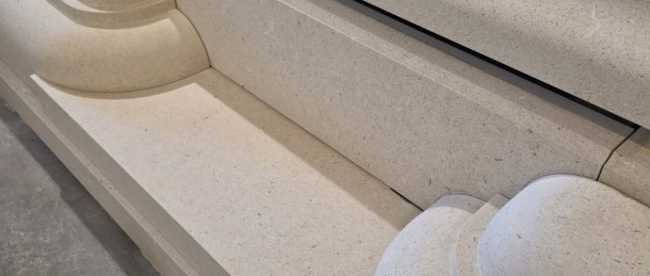Kamen koji koristimo dolazi s otoka Brača. Njegova svijetla, topla nijansa i fina struktura čine ga idealnim materijalom za ovakve projekte. Površine su pažljivo brušene, rubovi precizno oblikovani. Kameni profili izmjenjuju se između ravnih i oblih linija – taj kontrast daje dubinu i eleganciju formi. Donji dijelovi masivni su i stabilni, dok gornji elementi djeluju laganije, gotovo lebdeće. Sve zajedno stvara osjećaj smirenosti i trajnosti.