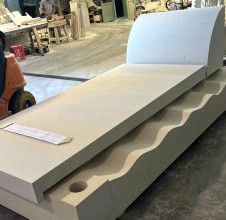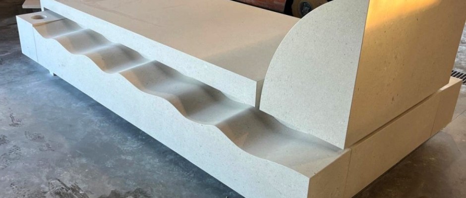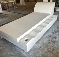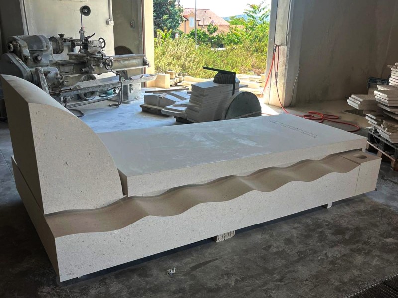 Ova grobnica izrađena je od bijelog bračkog kamena, materijala koji je zbog svoje čvrstoće, dugotrajnosti i profinjene strukture sinonim za monumentalnost i eleganciju. Dizajn kombinira stroge ravne linije s mekanim, valovitim oblicimakoji daju dinamiku i čine formu vizualno zanimljivom. Upravo ti valoviti elementi posebno su složeni za izvedbu u monolitnom kamenom bloku, jer zahtijevaju precizno klesanje i potpuno kontroliranu obradu površine.