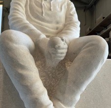 Kao i u mnogim našim djelima, i za ovu skulpturu odabran je bijeli brački kamen, poznat po svojoj čistoći, trajnosti i plemenitoj strukturi. Upravo ovaj kamen stoljećima se koristi za monumentalna djela i sakralne objekte, a u ovom slučaju postaje nositelj osobne i emotivne priče. Njegova čvrstoća jamči trajnost, a nježna svjetlina idealna je za prikaz toplih ljudskih emocija i suptilnih detalja.