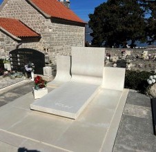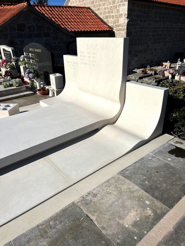 Grobnica obitelji Biočina, smještena u Postirima na otoku Braču, jedinstven je primjer suvremenog oblikovanja u bijelom bračkom kamenu. Postavljena uz staru kamenu crkvu, u prostoru koji odiše tradicijom, ona nenametljivo, ali jasno donosi novi umjetnički jezik – jezik čistih linija, elegantnih krivulja i precizno oblikovanih ploha koje zajedno tvore skladnu, suvremenu cjelinu.