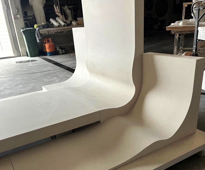 Površine su glatke, minimalističke i čiste, dok blage krivulje stvaraju elegantan kontrast okolnim tradicionalnim spomenicima. U bijelom bračkom kamenu, poznatom po svojoj profinjenoj strukturi i trajnosti, ovako izvedene linije posebno dolaze do izražaja.