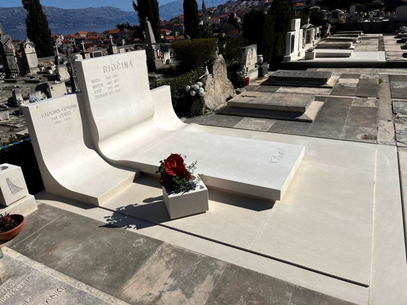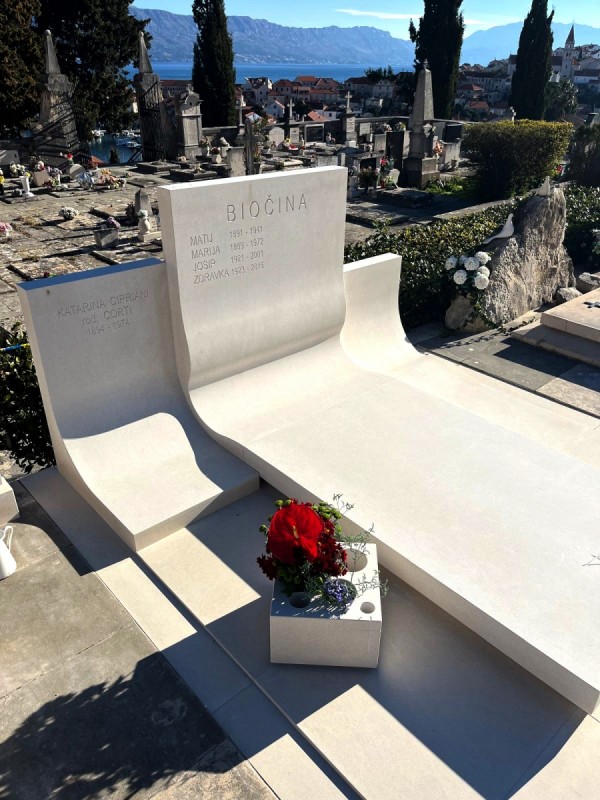 Grobnica obitelji Biočina tako predstavlja spoj umjetničke vizije, vrhunskog klesarskog umijeća i tehničke preciznosti. U prostoru ispunjenom tradicijom, ona unosi suvremenost izvedenu s mjerom i poštovanjem. Rezultat je trajno, dostojanstveno djelo koje u bijelom bračkom kamenu čuva uspomenu – smireno, profinjeno i potpuno jedinstveno.