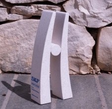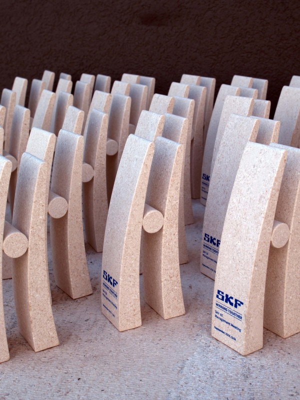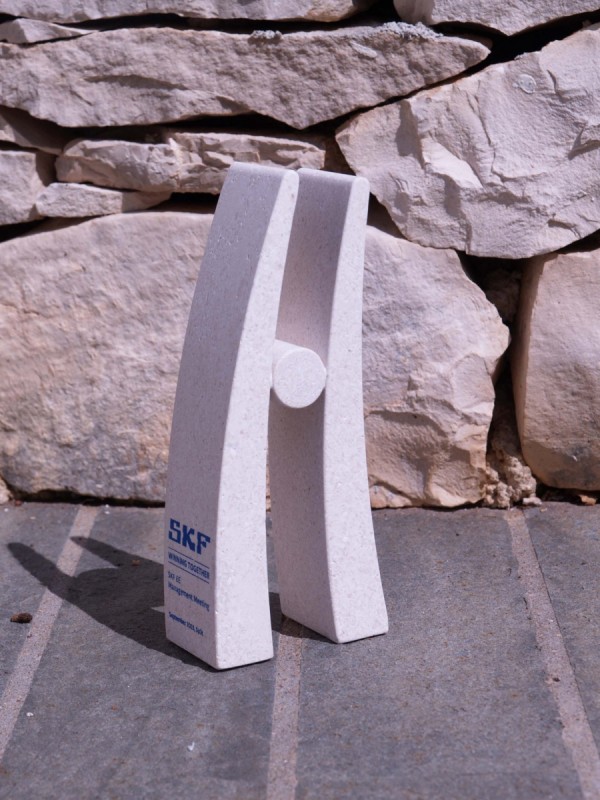 Za ovu priliku kreirali smo stiliziranu kamenu figuru inspiriranu jednim od najpoznatijih proizvoda tvrtke SKF – ležajem. Upravo taj industrijski element poslužio je kao polazište za oblikovanje moderne, elegantne figure s podignutim rukama. Takav stav tijela simbolizira uspjeh, zajedništvo i napredak, vrijednosti koje snažno prate filozofiju same tvrtke. Minimalistički dizajn, čiste linije i kontrast između punih i praznih volumena čine ovu kamenu figuruprepoznatljivim i vizualno upečatljivim poklonom.