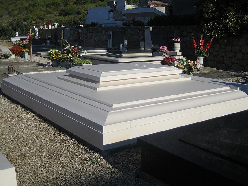 - ova grobnica za obitelj Mladena Bajića ističe se svojom jednostavnošću, profinjenošću i izuzetnom prisutnošću u prostoru. Izrađena od bijelog bračkog kamena, ona već na prvi pogled dominira grobljem i privlači pažnju svojom savršenom ravnotežom između klasičnih proporcija i modernog izraza. Iako je zasad izveden samo osnovni dio bez nadgrobnog spomenika, već sam volumen i precizno oblikovane površine daju grobnici karakter monumentalnosti. Čiste linije i uravnoteženi prijelazi stvaraju dojam smirenosti i dostojanstva, dok fini kameni profili podsjećaju na klasične arhitektonske detalje, reinterpretirane kroz suvremeni minimalistički pristup. Posebnu pažnju privlači centralno pozicionirana nadgrobna ploča s urezanim prezimenom Bajić, izvedenim u jednostavnom, ali snažnom tipografskom izrazu. Ta jasnoća i čitkost slova odražava ideju trajnosti i poštovanja, čineći natpis važnim estetskim elementom cjeline. Ono što ovu moderno oblikovanu grobnicu dodatno izdvaja jest njezina monumentalna forma koja se skladno uzdiže iz tla, ali bez agresivnosti. Svaka površina obrađena je s posebnom pažnjom — rubovi su precizno definirani, a prijelazi blago zaobljeni, što doprinosi dojmu mekoće i plemenite jednostavnosti. Unatoč svojoj jednostavnosti, grobnica odiše bogatstvom u detalju. Klesarska radionica Jakšić ovdje je postigla savršen spoj tehničke preciznosti i likovne discipline. Riječ je o djelu koje svojom tišinom i suzdržanom elegancijom izražava duboko poštovanje prema prostoru i onima koji u njemu počivaju. Grobnica obitelji Mladena Bajića dio je kompozicije od tri grobnice koje tvore skladnu cjelinu, ali i svaka za sebe nosi vlastiti identitet i izražaj.