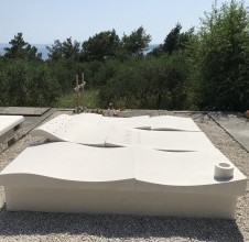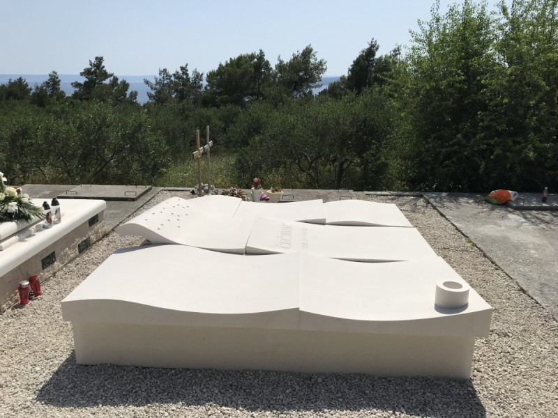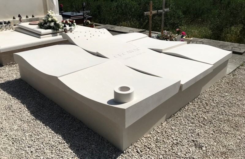 - izrada grobnice od bijelog bračkog kamena uvijek je spoj vrhunske preciznosti i umjetničkog oblikovanja. Ova velika grobnica izrađena je od masivnih blokova kamena i već na prvi pogled odaje dojam elegancije, snage i trajnosti. Površina grobnice stilizirana je tako da podsjeća na uzburkano more i valove. Linije kamena nisu strogo ravne, već valovite i dinamične, što unosi pokret i život u formu od masivnog kamena. Na najvećem valu oblikovane su perforacije – otvori koji su funkcionalni i omogućuju poseban svjetlosni efekt. Ispod ovog valovitog dijela smješteni su utori za svijeće. Kada se svijeće zapale, njihova svjetlost prolazi kroz rupe u kamenu i stvara jedinstvenu atmosferu. Noću, grobnica poprima gotovo skulpturalni karakter – plamen i kamen stapaju se u snažan simbol sjećanja i vječnosti. Poseban naglasak zaslužuje vaza u prednjem dijelu grobnice. Oblikovana je iz istog bijelog bračkog kamena, ali kružnog vertikalnog oblika, što stvara snažan kontrast u odnosu na valovitu površinu grobnice. Time se postiže ravnoteža između pokreta i smirenosti, a vaza, iako funkcionalna, postaje i skulpturalni element koji upotpunjuje cijeli spomenik. Ovakva izvedba zahtijeva veliko iskustvo u kamenoklesarskim radovima. Svaki element – od masivnih ploča do detalja perforacija i utora – izrađen je s najvećom preciznošću. Korišten je isključivo bijeli brački kamen, poznat po svojoj ljepoti i trajnosti, što grobnici daje plemenit i svečan izgled. Ova grobnica pokazuje kako izrada nadgrobnog spomenika može postati pravo umjetničko djelo koje odražava prirodu, emocije i osobnu priču.