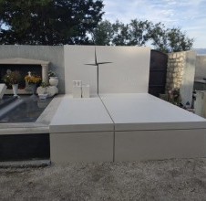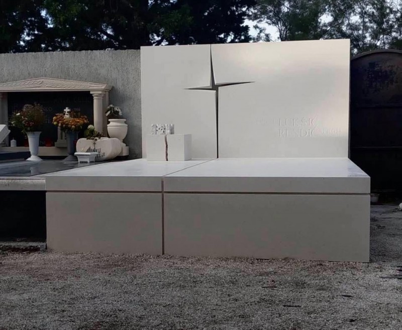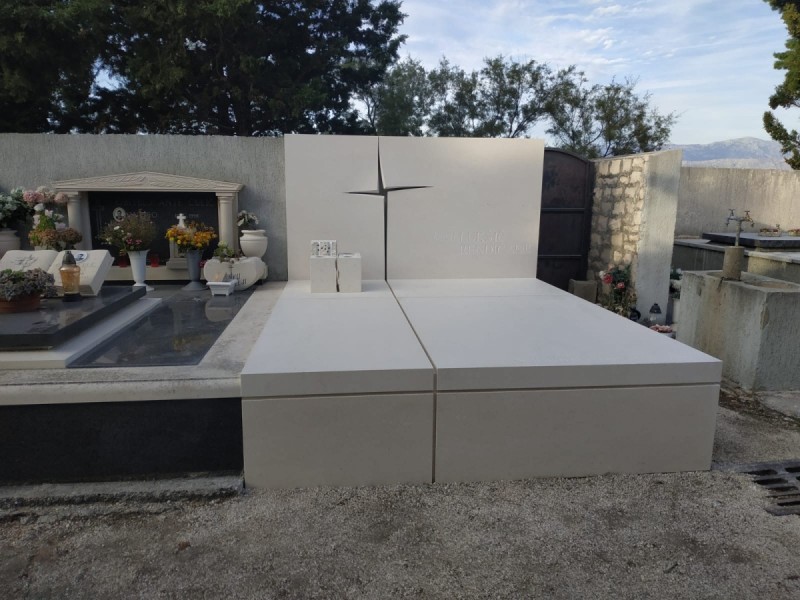 - S ponosom predstavljamo grobnicu u Supetru, izrađenu od bijelog bračkog kamena, koja je istaknuti primjer klesarstva i inovativnog dizajna. Autor projekta je arhitekt Srđan Lukšić, koji je za ovu realizaciju dobio prestižnu nagradu Tripun Bokandić. Ova grobnica nije samo spomenik, već i djelo koje objedinjuje tehničku zahtjevnost i snažnu simboliku. Dominantni element grobnice je križ, izveden na potpuno jedinstven način. Oblikovan je tako da izgleda kao da se sama kamena ploha otvorila, a praznina unutar nje stvorila formu križa. Ovaj detalj donosi snažnu duhovnu poruku i naglašava duboku simboliku vjere i vječnosti. Još jedan upečatljiv detalj je vaza izrađena iz jednog jedinog komada kamena. Kamen je pažljivo oblikovan i napukao na način koji daje posebnu estetsku vrijednost cijelom spomeniku. Takva izvedba zahtijevala je vrhunsku preciznost i znanje majstora klesara. Grobnica se ističe čistim linijama i minimalističkim pristupom, koji se rijetko viđa u tradicionalnim izvedbama. Upravo ta kombinacija moderne estetike i tradicionalnog bračkog kamena daje ovom nadgrobnom spomeniku poseban identitet i trajnu vrijednost.