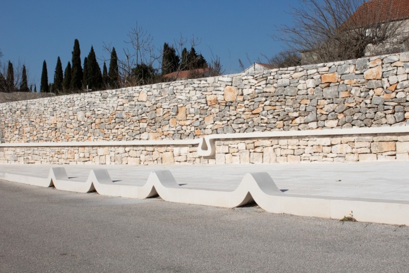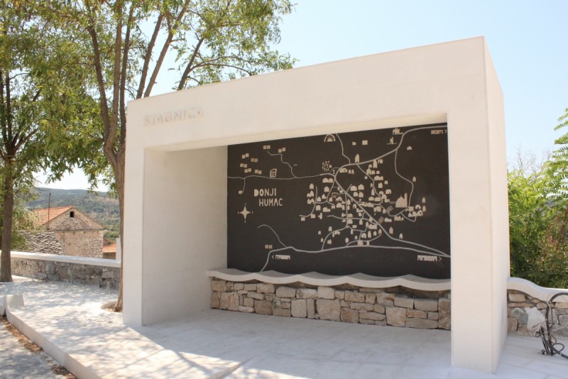- projekt uređenja trga Stagnica u Donjem Humcu predstavlja izniman primjer suvremenog promišljanja javnog prostora utemeljenog na tradicijskoj obradi kamena i suvremenim oblikovnim principima. Uspostava skladne ravnoteže između funkcionalnosti, identiteta mjesta i iznimne kvalitete izvedbe rezultirala je prostorom koji podiže standarde uređenja javnog prostora na otoku Braču. Projektni koncept razvila je dr.art. Dina Jakšić Pavasović, koja je u projekt unijela osobna sjećanja, memoriju prostora i znanje o materijalu. Naša klesarska radionica izvela je najkompleksnije dijelove: valovite kamene ivičnjake koji formiraju originalne autostopere – bube, te sustav kameni pod, kamene obloge, kameni zid, kamenu potklopnicu i elemente oblikovane od tradicionalnog suhozida. Drugi dio Stagnice uključuje nekoliko tehnički i oblikovno iznimno zahtjevnih elemenata: specifičnu kamenu formu koja unosi dinamiku u prostor, kamene ploče za držanje bicikli, te na podu izvedene kamene brojeve koji čine kamenu „školu“ – tradicionalnu igru reinterpretiranu kroz suvremeni kameni dizajn. Takvi sadržaji potiču djecu na boravak vani, razvijaju motoričke vještine i socijalnu interakciju, stvarajući javni prostor koji ima društvenu i pedagošku vrijednost. U sklopu uređenja nastala je i monolitna kamena česma odnosno kamena fontana, te oblikovno posebno riješena autobusna stanica, u kojoj se kombiniraju kamena klupa, suhozid i valovita kamena potklopnica. Posebno se ističe karta Donjega Humca, koju su izradila djeca iz mjesta kroz edukativno-kreativnu radionicu o kamenu. U stručnom smislu riječ je o važnom segmentu participativnog dizajna: uključivanje djece u stvaranje sadržaja unosi novu razinu identiteta u javni prostor, jača osjećaj pripadnosti i čini kartu baštinskim simbolom koji nadilazi dekorativnu funkciju. Stagnica je danas primjer kako se uređenje javnog prostora može razvijati kroz dijalog tradicije, suvremenog dizajna i vrhunskog majstorstva obrade kamena.
