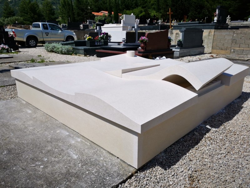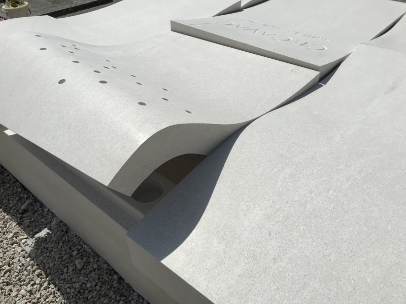 Come molte nostre precedenti realizzazioni, anche questa tomba porta con sé un forte legame con l’eredità familiare e con il lavoro che la famiglia ha svolto nel corso degli anni. L’intera struttura funeraria è stata progettata per evocare il motivo del mare e delle onde, un tema ricorrente nei nostri lavori, ma qui interpretato in un modo completamente nuovo e originale. La tomba è composta da più superfici in pietra che si uniscono creando linee morbide e ondulate. A differenza dei lavori precedenti, dove le onde comparivano sul monumento o come semplice dettaglio decorativo, qui l’intera tomba diventa una superficie continua che ricorda un orizzonte marino tranquillo ma vivo – come se la massa di pietra vibrasse dolcemente al vento.