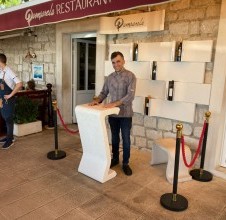 La realizzazione in pietra è opera del nostro laboratorio, mentre il design porta la firma di Dražen Jakšić e Dr. art. Dina Jakšić Pavasović. Oltre alla parete principale per la presentazione dei vini, è stato creato anche un banco scultoreo ricavato da un unico blocco di pietra di Brač. La sua forma fluida e piegata lo rende un elemento funzionale di grande impatto visivo per l’accoglienza degli ospiti. Completa l’insieme uno sgabello in pietra, coerente per forma e materiale con l’intero concept.