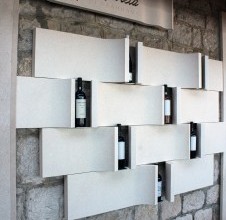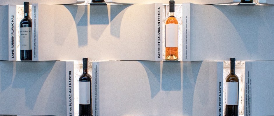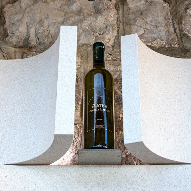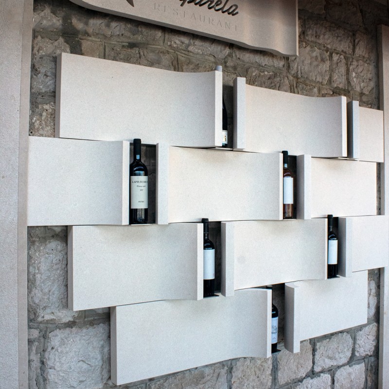 Il concept prevede una parete in pietra bianca di Brač che, in punti selezionati, si “apre” creando nicchie scolpite con precisione, nelle quali vengono esposte le bottiglie. Accanto a ogni bottiglia sono incise le informazioni relative al vino, trasformando la pietra in un elemento estetico e informativo. Progetti come questo dimostrano come la pietra modellata in modo creativo possa valorizzare l’allestimento degli spazi pubblici, migliorando funzionalità ed esperienza spaziale.