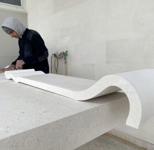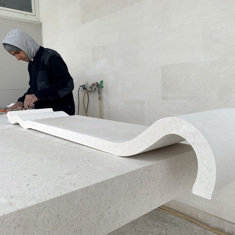 Il pregio del progetto è l’impressione di leggerezza ottenuta nonostante la solidità del materiale. Forme contemporanee, bordi morbidi e proporzioni accuratamente bilanciate conferiscono alla pietra un aspetto sorprendentemente fluido, pur mantenendo eleganza e solidità.