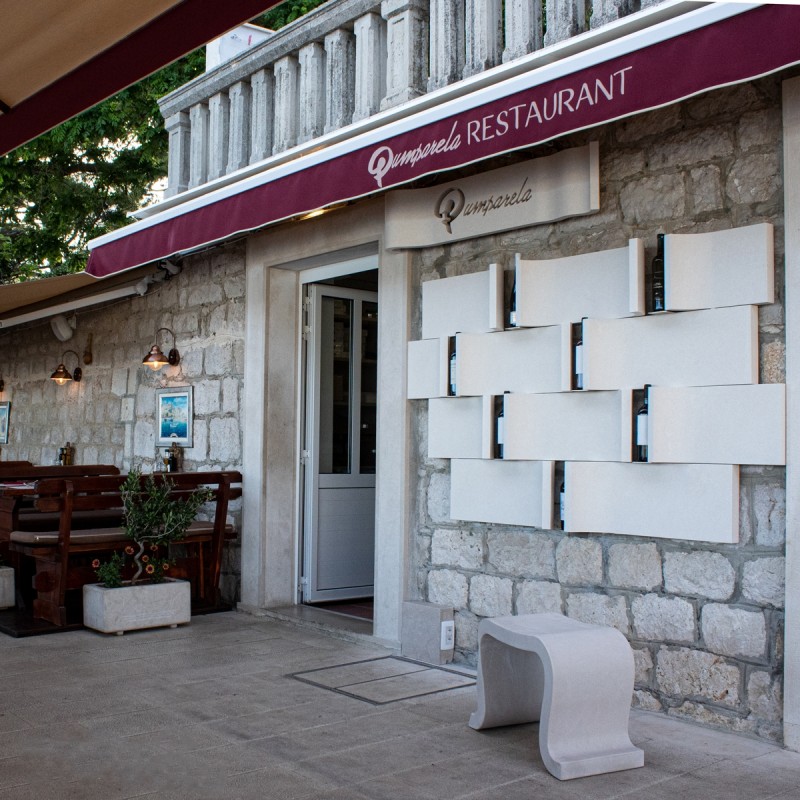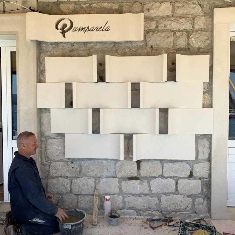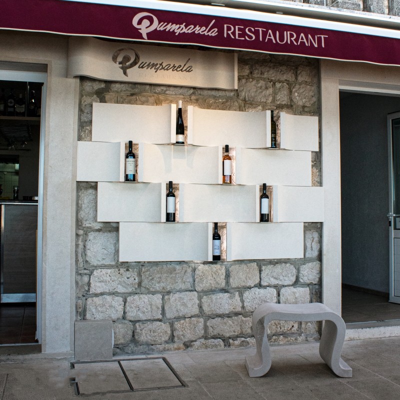 Il laboratorio Jakšić presenta con orgoglio un nuovo progetto realizzato per l’area esterna del ristorante Pumparela – una soluzione elegante che unisce funzionalità, arte e tradizione nella lavorazione della pietra. Poiché il ristorante offre una ricca selezione di vini, l’obiettivo era creare una parete in pietra appositamente progettata che fungesse sia da elemento visivo sia da esposizione funzionale dei vini.