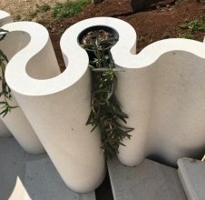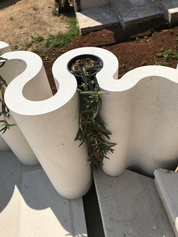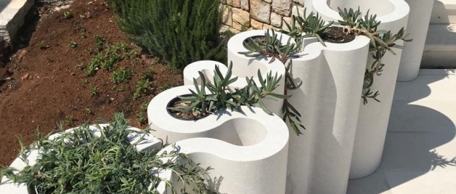 La funzionalità del muro va ben oltre il suo ruolo decorativo. Grazie alle cavità e agli spazi negativi generati dai moduli circolari, il muro diventa un supporto ideale per vasi in pietra e illuminazione integrata. Le aperture accolgono perfettamente fioriere in pietra, che si fondono armoniosamente con la struttura e valorizzano ulteriormente l’esterno.