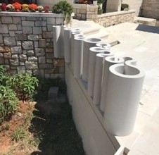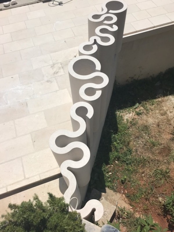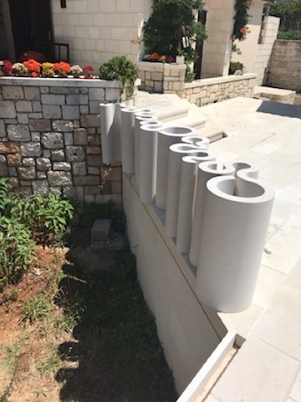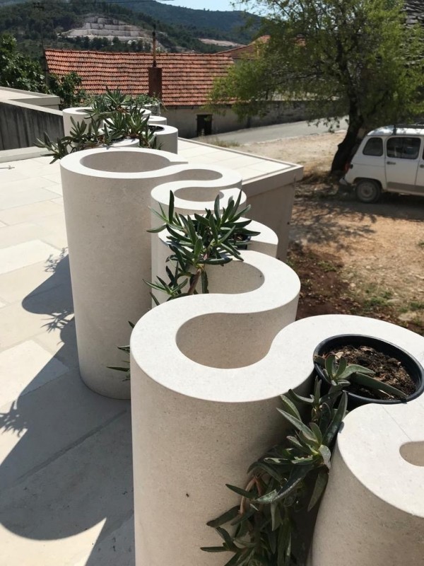 Ispirato da quel precedente progetto, Stjepko ha ideato un nuovo intervento concettuale – un muro modulare in pietraper una casa privata a Donji Humac, sull’isola di Brač. L’opera presenta una forma estremamente complessa basata su una sequenza di moduli circolari collegati tra loro, che creano ritmo, movimento e una particolare morbidezza visiva nello spazio. Grazie al principio modulare è stato possibile assemblare gli elementi con precisione, mentre la nostra bottega ha eseguito con grande cura tutti gli aspetti strutturali ed estetici, trasformando il progetto in un elemento architettonico funzionale e scenografico.