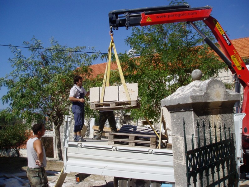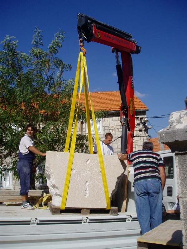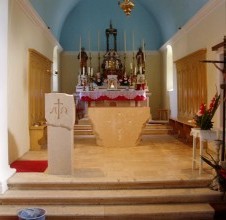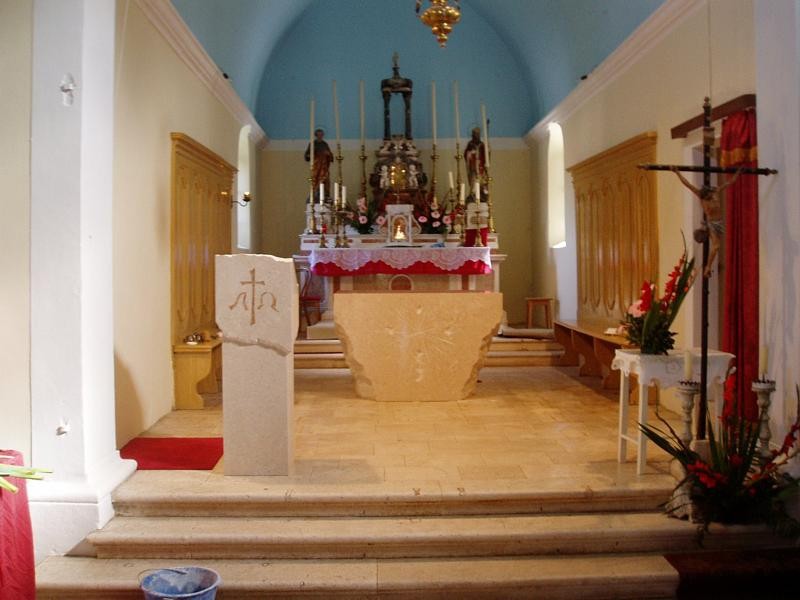 - la chiesa dei Santi Cosma e Damiano nel villaggio di Dračevice, sull'isola di Brač, ha iniziato la sua costruzione nel XVII secolo ed è uno degli esempi caratteristici dell'architettura sacra delle isole dalmate. Questi oggetti sacri sono oggi arricchiti da nuovi elementi liturgici in pietra: un altare e un ambone, progettati ed eseguiti dal nostro scultore accademico Lovre Jakšić, proprietario della bottega di scultura Jakšić. Nel progettare l'intervento, lo scultore ha voluto rispettare appieno lo spazio originario della chiesa, introducendo allo stesso tempo un linguaggio formale contemporaneo nella lavorazione della pietra. L'altare colpisce per la sua forma particolare: la parte frontale è liscia e finemente lavorata, mentre i lati sono lasciati grezzi e spaccati, creando un effetto visivo dinamico tra luce e ombra. La forma si allarga leggermente verso l’alto, conferendo all’altare una presenza monumentale. Sulla parte anteriore, il simbolo della croce è inciso in modo sottile con colpi e graffi sulla pietra, richiamando simbolicamente le ferite e il martirio. Anche l’ambone è realizzato in modo originale: la forma geometrica rigorosa è ammorbidita da una linea ondulata organica che divide visivamente l’elemento in due parti. Nella parte superiore, i simboli cristiani Alfa e Omega sono inseriti come intarsio con una pietra speciale dell’isola di Brač chiamata Drstva, a rappresentare l’inizio e la fine. L’altare e l’ambone sono realizzati in una varietà di pietra di Brač chiamata Draževica, che prende il nome dalla località vicina da cui viene estratta, sottolineando così il legame tra materiale e luogo.