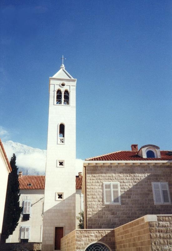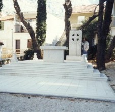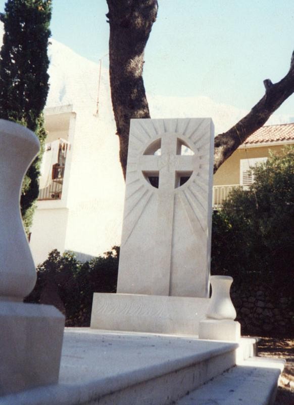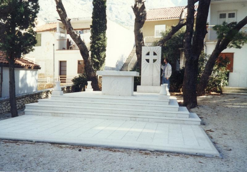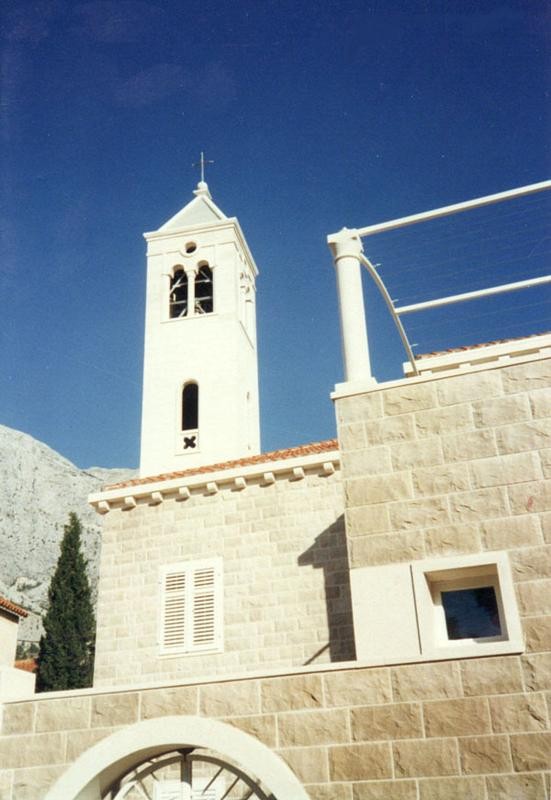 - i lavori presso la chiesa di Baška Voda rappresentano un altro notevole esempio dell’attività della nostra bottega di scalpellini nel campo dell’architettura sacra. Il progetto, realizzato su disegno dell’architetto Ante Rožić di Makarska, ha compreso la costruzione di un campanile in pietra e di uno spazio liturgico esterno – l’altare con gli elementi che lo circondano. Gli oggetti sacri di questo tipo richiedono grande maestria, attenzione al simbolismo e profondo rispetto per la tradizione e i materiali. Il campanile, interamente realizzato in pietra bianca di Brač, si impone con la sua eleganza verticale, simboleggiando l’elevazione spirituale. Il rivestimento in pietra copre l’intera altezza e i blocchi perfettamente sagomati garantiscono armonia e monumentalità. Le finestre in pietra, ben proporzionate, lasciano penetrare la luce naturale. La parte superiore è caratterizzata da una bifora in pietra riccamente profilata – una doppia finestra con colonna centrale – che conferisce al campanile la sua identità architettonica. È stato realizzato anche un altare esterno, che consente di celebrare la Messa all’aperto. L’intera area liturgica è rivestita in pietra: il pavimento, la base e l’altare stesso. Il pavimento è disposto su più livelli, a sottolineare la sacralità del luogo e facilitare lo svolgimento del rito. L’altare, scolpito in pietra bianca, presenta un rilievo sulla facciata anteriore, mentre un elemento verticale posto dietro con una croce scolpita collega simbolicamente il cielo e la terra. Lo spazio liturgico è ulteriormente definito da quattro elementi in pietra agli angoli, che delimitano simbolicamente l’area sacra e completano la composizione. L’insieme emana semplicità e solennità, unendo la tradizione alla sensibilità scultorea contemporanea. La pietra ha sempre avuto un ruolo speciale nell’architettura sacra – come materiale naturale, durevole e solido, simboleggia la permanenza e la purezza spirituale. Questo progetto conferma ancora una volta che la pietra bianca di Brač, lavorata da mani esperte, si trasforma in un potente mezzo di espressione spirituale.