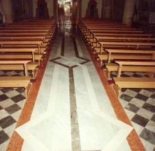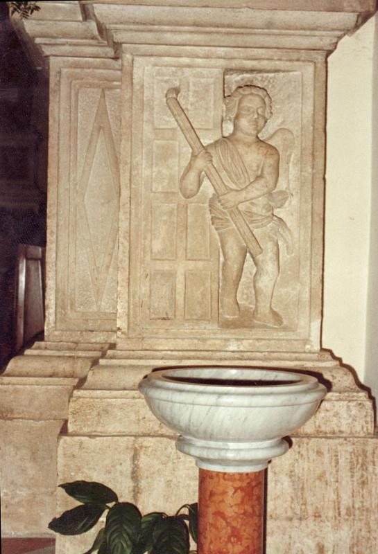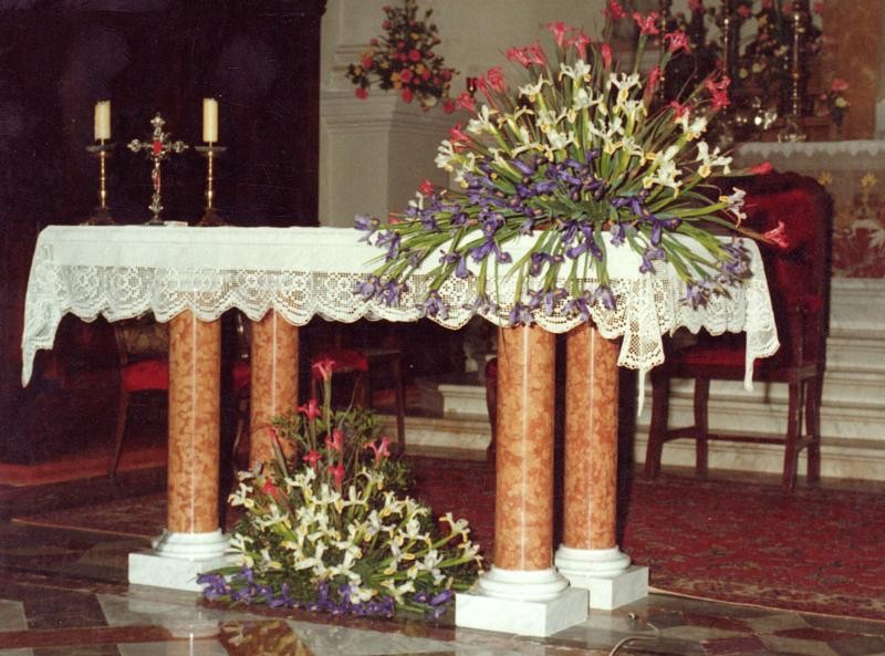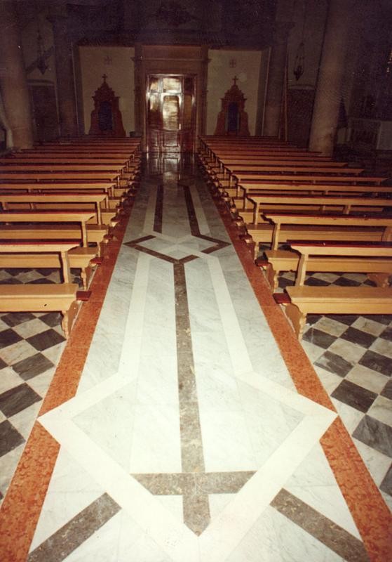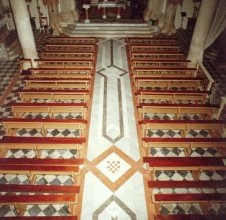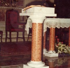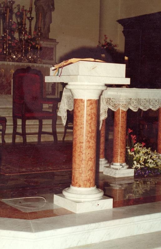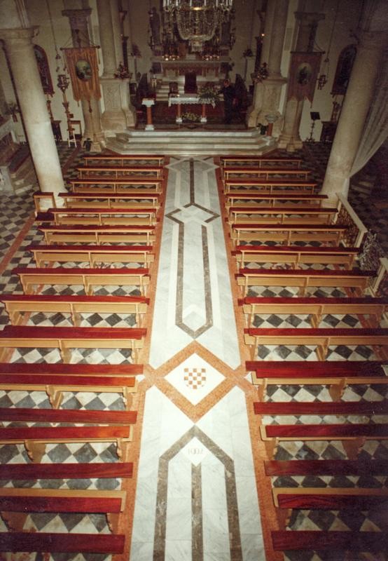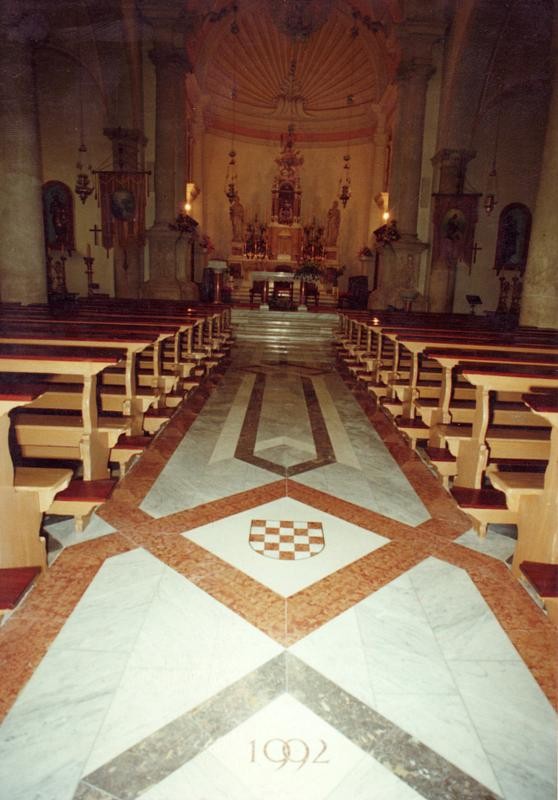- la ristrutturazione della Chiesa dell'Annunciazione a Milna, edificio sacro del XVIII secolo, ha rappresentato un grande onore per il nostro laboratorio. La chiesa ha vissuto diverse fasi di costruzione nel tempo, con il contributo di grandi maestri come Ignacije Macanović da Trogir, Trifun Bokanić e Ivan Rendić. Far parte di questa tradizione architettonica e contribuire con il nostro lavoro di pietra è stato per noi un privilegio. Negli anni '90 la nostra officina ha eseguito l’intero intervento di restauro, che ha incluso la realizzazione del pavimento in pietra e delle scale interne. Il progetto del disegno del pavimento è stato firmato dalla scultrice Dijana Rošin e la nostra officina ha curato la produzione e la posa in opera. Tutto il lavoro è stato fatto rispettando appieno l’ambiente storico della chiesa, scegliendo forme e materiali in sintonia con la struttura esistente. L'altare, l’ambone e il fonte battesimale sono stati progettati e realizzati dal nostro laboratorio sotto la guida di Dražen Jakšić. L'altare poggia su colonne cilindriche in marmo rosso Rosso Verona, con piano in marmo bianco lucido. L’ambone segue la stessa logica stilistica: una forma semplice e solida poggiata su una sola colonna in marmo rosso, con base quadrata in marmo bianco. Il fonte battesimale è anch’esso su una colonna in marmo rosso, con catino tondo in marmo bianco. Particolarmente significativo è il pavimento in pietra, realizzato con diverse varietà di marmo, in particolare Rosso Verona e Carrara. Davanti all'altare è incastonato lo stemma della Croazia in pietra, accompagnato dall’anno di completamento – 1992. Questo progetto, appartenente alla categoria degli oggetti sacri, dimostra come l’arte della pietra possa essere al servizio della spiritualità e del rispetto per il patrimonio liturgico.