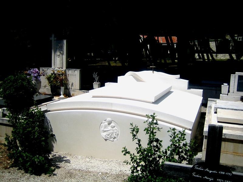- un’altra tomba unica e artisticamente concepita realizzata nel nostro laboratorio testimonia la maestria nella lavorazione della pietra bianca di Brač e un approccio moderno all’architettura funeraria. Fin dal primo sguardo colpisce per la sua forma arcuata e armoniosa – l’intera struttura è modellata come un arco, con la lastra principale che segue la stessa linea morbida, creando un senso di movimento e equilibrio nella pietra. Il monumento centrale è coperto da due grandi forme di pietra, scolpite come foglie organiche che si sovrappongono delicatamente. Queste forme fluide e naturali creano un contrasto elegante con la base geometrica, fondendo precisione architettonica e ispirazione naturale in un insieme poetico e suggestivo. Sul fronte della tomba si trova un medaglione in pietra con un rilievo ispirato a Michelangelo, realizzato con cura dall’artista accademico Lovre Jakšić. Questo dettaglio conferisce valore artistico e raffinatezza classica, creando un legame tra l’arte storica e il design contemporaneo della pietra. Realizzata in collaborazione con l’architetta Ivanka Filipović, la tomba rappresenta un perfetto equilibrio tra architettura, scultura e simbolismo. La purezza del bianco marmo di Brač, unita a forme raffinate, enfatizza la bellezza e la serenità del monumento. Questa opera dimostra come la realizzazione di una tomba possa diventare una vera forma d’arte, dove la maestria artigianale e l’espressione simbolica si fondono in una creazione senza tempo, segno di dignità, eleganza e eternità.