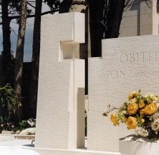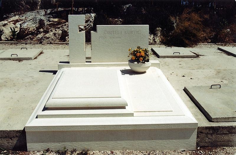- la tomba della famiglia Kurtić, realizzata in pietra bianca di Brazza, rappresenta un equilibrio perfetto tra artigianato tradizionale e design contemporaneo. Pur essendo di piccole dimensioni, si distingue per la purezza delle linee e l’eleganza delle proporzioni. L’elemento principale è la lapide composta da due blocchi di pietra, tra i quali si apre uno spazio che forma una croce. Questa interpretazione moderna e minimale del simbolo sacro dona alla tomba una forte presenza spirituale. La croce appare incompleta nella forma, ma immediatamente riconoscibile, suggerendo profondità e significato attraverso la semplicità. La superficie della pietra è bocciardata finemente, conferendo un aspetto opaco e naturale che valorizza la luminosità della pietra di Brazza. L’intera composizione è leggermente asimmetrica, ma perfettamente bilanciata grazie alle proporzioni studiate e al dialogo tra le masse. Una coppa in pietra tornita, dal profilo morbido e armonioso, introduce un elemento di contrasto rispetto alle linee geometriche del monumento. Questo dettaglio, realizzato con tecnica di tornitura della pietra, aggiunge un tocco di eleganza e completezza visiva. La tomba della famiglia Kurtić è un raffinato esempio di design moderno per monumenti funebri, dove arte, simbolismo e maestria artigianale si fondono in un’unica espressione di serenità e bellezza senza tempo.
