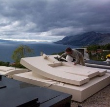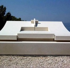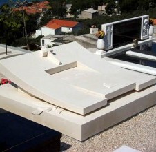 - la tomba della famiglia Medić è una delle opere più imponenti e audaci realizzate nel nostro laboratorio. Fin dal primo sguardo colpisce per la sua forma dinamica e ascendente, poiché l’intera superficie della tomba si eleva in un arco verso l’alto, formando il monumento stesso. Questo approccio originale alla lavorazione della pietra la rende un esempio straordinario di design contemporaneo in pietra bianca di Brač. In cima alla composizione si trova una croce in pietra, centro simbolico e visivo del monumento. Sotto di essa, la lastra principale rimane piana e semplice, ma è arricchita da un rilievo raffigurante la Pietà di Michelangelo, simbolo di dolore e di legame eterno tra la vita e la morte. Sui lati, foglie scolpite a mano ammorbidiscono la rigidità geometrica, creando un contrasto armonioso tra linee architettoniche rigorose e forme naturali. L’equilibrio tra la precisione geometrica e i dettagli emotivi conferisce a questa tomba una bellezza rara e raffinata. Il dialogo tra minimalismo e espressività la rende unica e piena di significato. Realizzata in collaborazione con l’architetta Ivanka Filipović, questa tomba si distingue tra i monumenti più classici per il suo contrasto elegante e armonioso. La sua forma scultorea, sobria e imponente, domina lo spazio circostante con discreta ma intensa presenza. La tomba della famiglia Medić è una dimostrazione di come l’arte della lavorazione della pietra e la visione artisticapossano trasformare la realizzazione di una tomba in una vera opera d’arte architettonica ed emotiva, simbolo di bellezza, maestria e eternità.