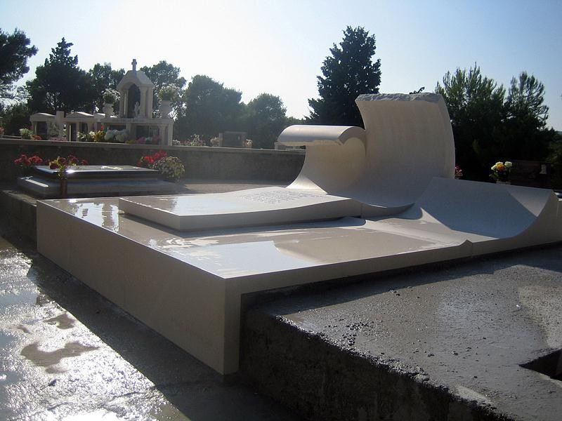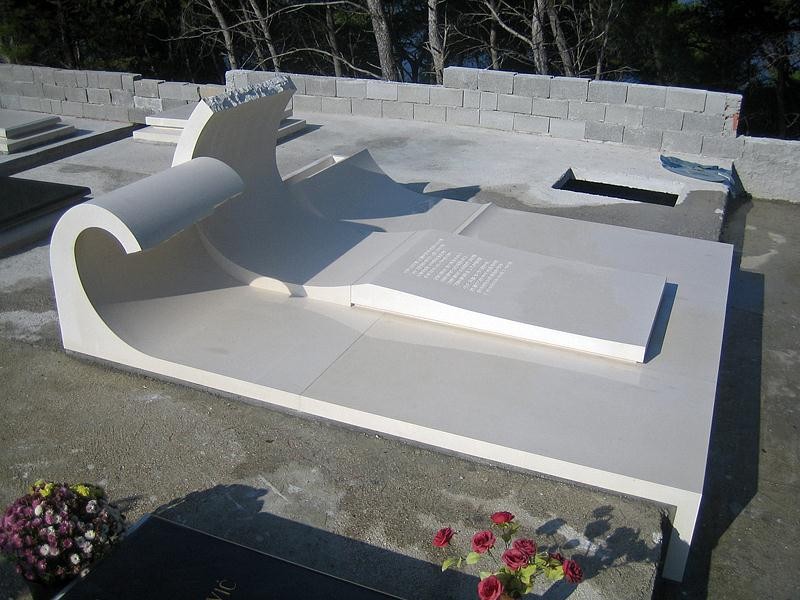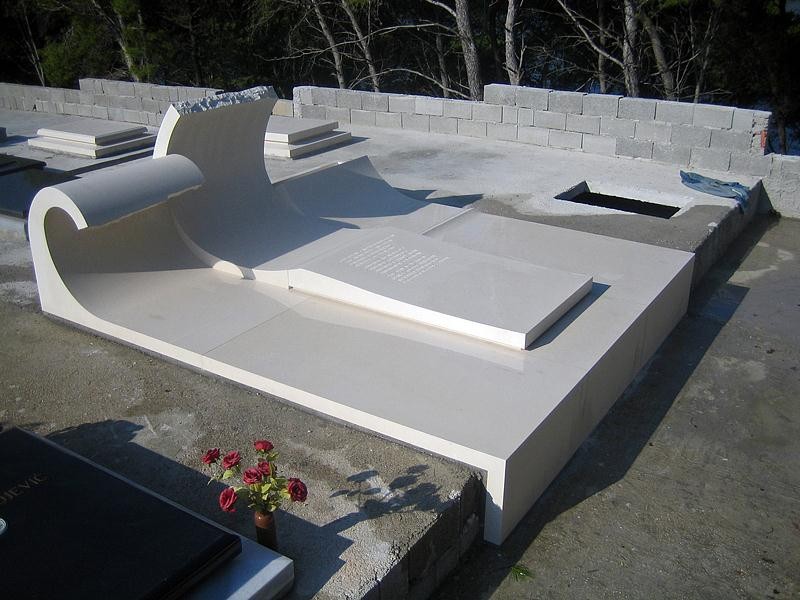- questa tomba, realizzata per la rinomata famiglia Arković della Dalmazia, unisce simbolicamente il mare e la pietra – due elementi fondamentali della loro vita e tradizione. Da generazioni pescatori, hanno voluto che la loro tomba fosse un omaggio eterno alla natura, al movimento e alla libertà. Realizzata in pietra bianca di Brazza, nota per la sua purezza e luminosità, la tomba emana eleganza e armonia. La superficie ondulata rappresenta l’onda marina nel momento della sua nascita, quando l’acqua si solleva e si trasforma – come la vita stessa. Questa forma poetica diventa un monumento funerario che sembra muoversi come il mare. La realizzazione della tomba ha richiesto grande abilità artigianale: ogni curva è stata modellata a mano con la massima precisione. Le estremità dell’onda, lasciate con una finitura grezza, evocano la schiuma del mare, mentre le altre superfici sono finemente levigate, lisce come l’acqua calma. Sulla lastra centrale, leggermente inclinata verso l’onda, sono incisi i versi di Oliver Dragojević dedicati al mare e alla vita dei pescatori – un tocco poetico che rende questa tomba in pietra di Brazza unica ed emozionante. Il design è firmato da Dražen Jakšić, proprietario e direttore del nostro laboratorio, che in questa tomba in pietra di Brazza ha unito mare, pietra ed emozione in un insieme armonioso. Questa tomba non è solo un luogo di memoria, ma un’opera d’arte che rappresenta la forza, la continuità e il movimento eterno – come il mare che ha plasmato la famiglia Arković.
