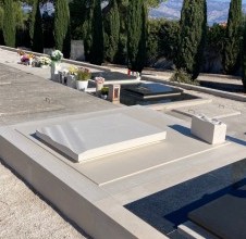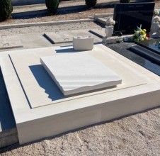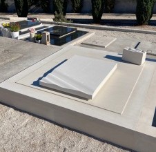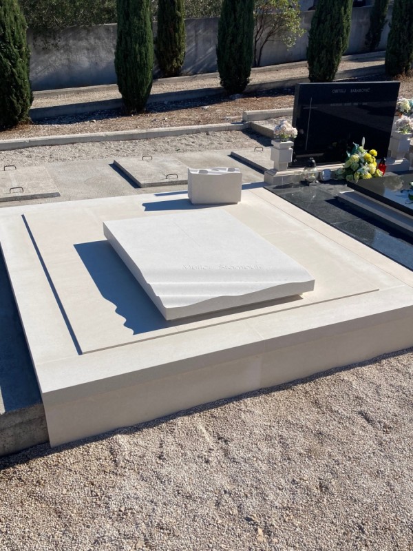 - questa piccola tomba, realizzata nella nostra bottega di lavorazione della pietra Jakšić, è un esempio di come anche un’opera apparentemente modesta possa raggiungere il carattere potente di una creazione monumentale. Sebbene si tratti di una sepoltura di dimensioni ridotte, il design accuratamente studiato e l’esecuzione magistrale le conferiscono dignità e forza che vanno ben oltre le sue proporzioni. L’intera tomba è stata realizzata in pura pietra di Brač bianca, con linee pulite e una forma calma ed equilibrata. Ma proprio in questa semplicità si celano interventi piccoli ma significativi, che donano al monumento un carattere artistico unico. La lastra principale della lapide si solleva leggermente da un lato e si piega come se fosse la superficie del mare mossa dal vento. La pietra, solida e massiccia, sembra qui farsi leggera e fluida, creando l’impressione di movimento e vita. Su questo dettaglio ondulato è inciso il nome della famiglia, rendendo la storia personale parte integrante dell’espressione artistica. Un altro dettaglio interessante è il vaso, la cui superficie superiore riprende la stessa linea fluida della lastra della lapide. In questo modo la tomba diventa un insieme unitario, in cui ogni elemento si completa, formando una composizione armonica. È un esempio della precisione della lavorazione lapidea e della cura progettuale che contraddistinguono la nostra bottega. Questa tomba ci è particolarmente cara perché dimostra quanto la pietra di Brač bianca possa essere espressiva nelle mani di un maestro scalpellino. Il design e la realizzazione sono firmati da Dražen Jakšić e confermano ancora una volta i valori della nostra bottega – l’unione tra tradizione, design contemporaneo e profondo rispetto per la memoria.