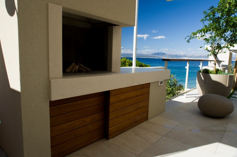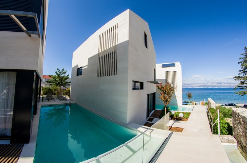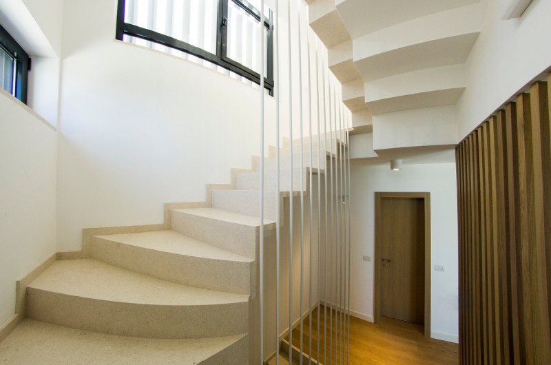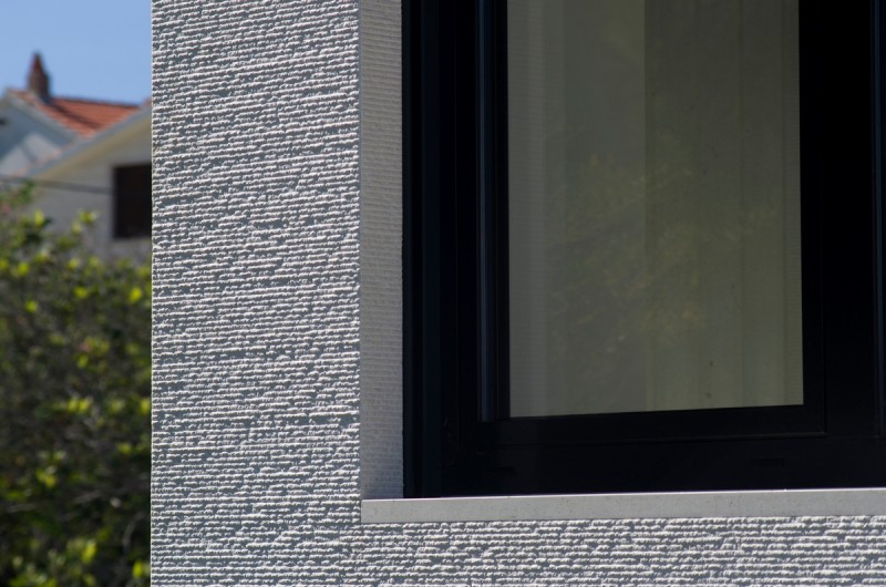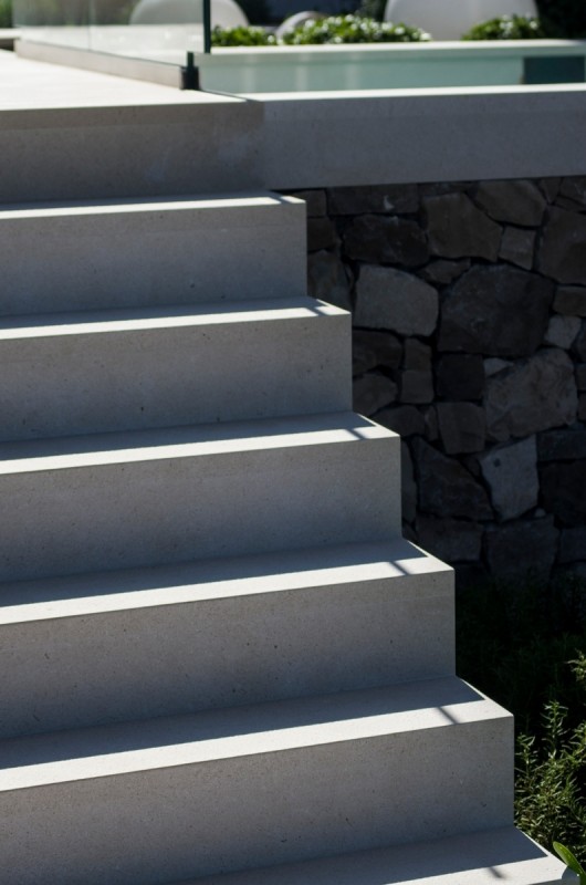 - tre ville moderne che formano un insieme architettonico armonioso rappresentano un eccellente esempio di architettura contemporanea con la pietra e di straordinaria maestria artigianale. Il progetto, firmato dall’architetto croato Vinko Peračić, valorizza appieno la pietra di Brazza attraverso una realizzazione precisa della nostra officina guidata da Dražen Jakšić. Le facciate sono realizzate in pietra bianca di Brazza, con la nostra caratteristica “facciata in pietra rigata” – una lavorazione esclusiva in cui la superficie viene incisa con scanalature orizzontali regolari, creando una texture raffinata e un delicato gioco di luce e ombra. Le linee, eseguite con grande precisione, conferiscono dinamismo e profondità visiva. Le giunzioni perfette delle lastre di pietra garantiscono la continuità delle linee, mentre gli angoli delle ville si uniscono senza interruzioni. Le aperture sono rifinite senza cornici in pietra, mantenendo linee pulite e moderne in sintonia con lo stile minimalista del progetto. Questo progetto ha ricevuto il primo premio “Tripun Bokanić” come miglior realizzazione architettonica in pietradel 2019, riconoscimento che conferma la qualità e il valore estetico dell’opera. Oltre alla facciata, la nostra officina ha realizzato tutti i pavimenti in pietra, le scale in pietra, il camino esterno in pietra, nonché l’intero arredo interno in pietra. Gli interni trasmettono calma ed eleganza – la pietra di Brazza negli interni dona calore e luminosità, mentre le rivestimenti in pietra e i dettagli in pietra esaltano la purezza architettonica dell’insieme. In questo progetto, la pietra per ville e case non è solo un materiale da costruzione, ma un elemento estetico essenziale che unisce interno ed esterno. Il risultato è un arredo interno di lusso in pietra, che fonde la tradizione mediterranea con il design contemporaneo e l’eccellenza artigianale.