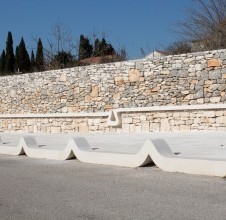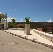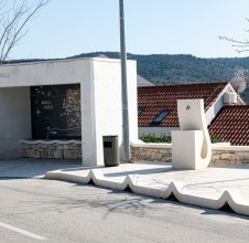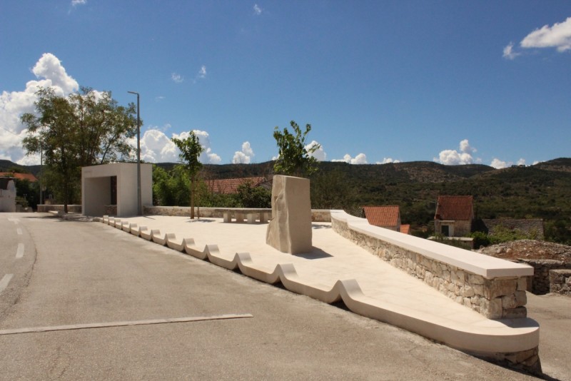- the redevelopment of Stagnica Square in Donji Humac represents an exceptional example of contemporary public space design grounded in traditional stone craftsmanship and modern design principles. The establishment of a harmonious balance between functionality, local identity, and outstanding execution quality has resulted in a space that raises the standards of public space development on the island of Brač. The project concept was developed by Dr. Art. Dina Jakšić Pavasović, who infused the project with personal memories, spatial experience, and deep material knowledge. Our stonemasonry workshop executed the most complex components: wave-shaped stone kerbs forming the original car stoppers – known locally as bube – as well as the complete system of stone paving, stone cladding, stone walls, stone seat covers, and elements created in the traditional dry-stone technique. The second section of Stagnica features several technically and formally demanding stone details: a distinctive sculptural stone form that introduces spatial dynamism, stone plates designed for bicycle support, and stone numbers inlaid into the pavement to create a stone version of the traditional game “školica” (hopscotch), reinterpreted through contemporary stone design. These features encourage children to spend time outdoors, fostering motor skills, social interaction, and cognitive development, resulting in a public space with both social and pedagogical value. The redevelopment also includes a monolithic stone water fountain, as well as an architecturally refined bus stationcombining a stone bench, dry-stone wall elements, and a wave-shaped stone seat cover. A particularly notable feature is the map of Donji Humac, created by local children through an educational and creative workshop on stone craftsmanship. From a professional standpoint, this is a significant example of participatory design: involving children in the creation of content introduces a new layer of identity to the public space, strengthens the sense of belonging, and transforms the map into a heritage symbol that transcends decorative purpose. Today, Stagnica stands as a model of how public space design can evolve through the dialogue between tradition, contemporary design, and masterful stone craftsmanship.