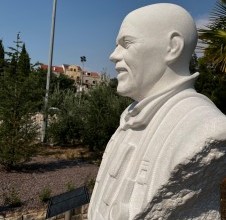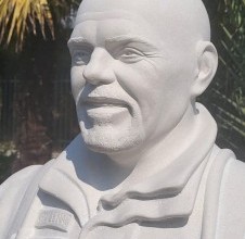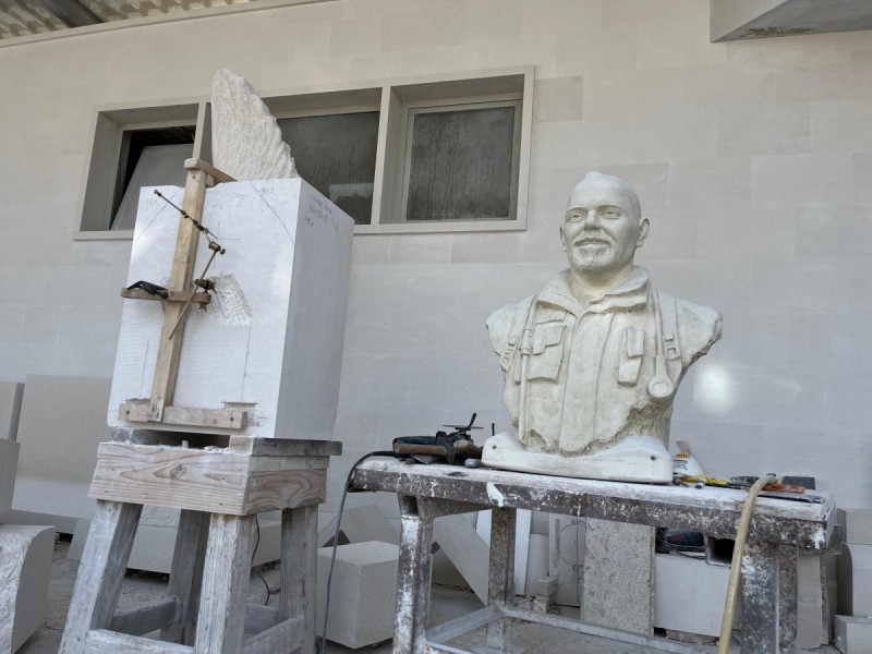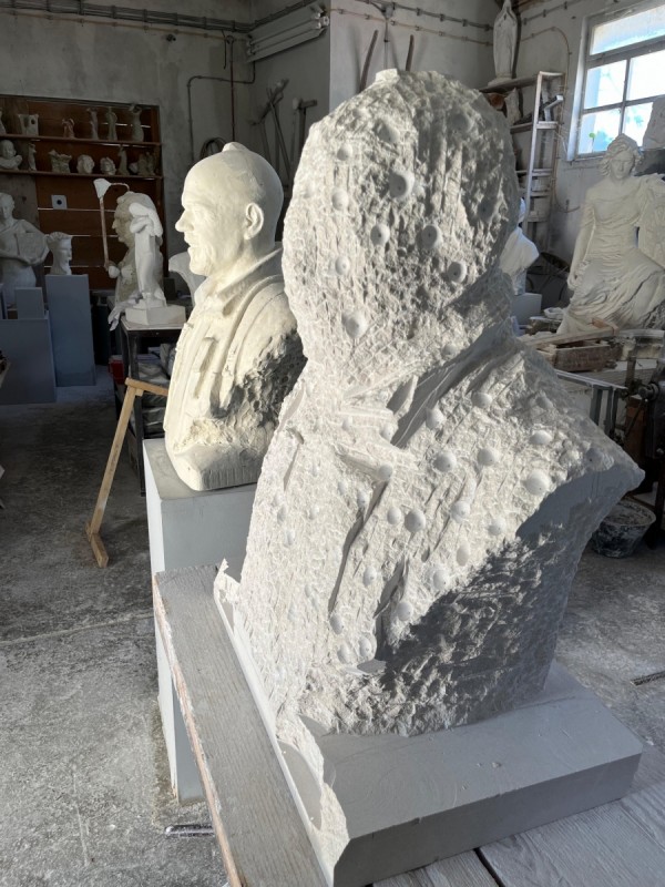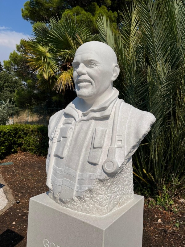 - the bust of firefighter Goran Komlenac is a portrait sculpture crafted from white Brač stone and mounted in the park of Antun Masle Primary School in Orašac, near Dubrovnik. It is one of the many monumental works by our academic sculptor Lovre Jakšić for public spaces. The creation of this stone bust followed a meticulous sculptural process. It began with a clay model sculpted in life-size proportions, capturing the subject’s likeness with great attention. From the clay, a plaster mould was created, followed by a plaster model used as a reference for stone carving. Using the traditional pointing technique, every detail of the portrait was transferred from plaster to Brač stone, resulting in a faithful and expressive portrait in stone. This portait sculpture is remarkable for the detailed rendering of the firefighter’s uniform, equipment, and facial expression – a calm and determined look that reflects the dignity of the man it commemorates. The spomenik is mounted on a solid stone pedestal, also crafted from white Brač stone, harmoniously integrated into the landscaped setting of the school park. This stone sculpture is not only a work of art but a permanent symbol of respect – a spomenik in white Brač stone dedicated to a hero.
