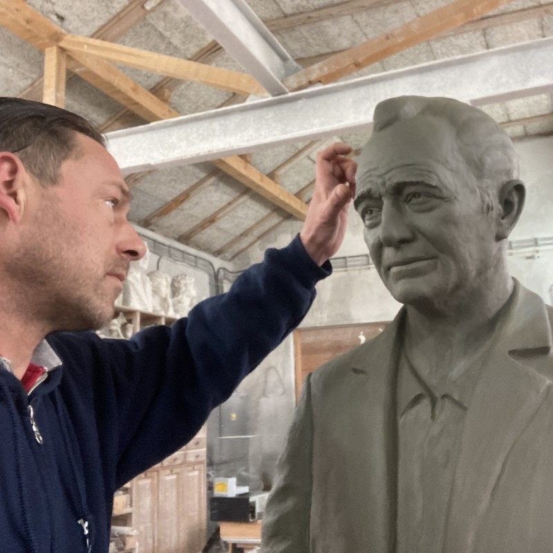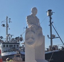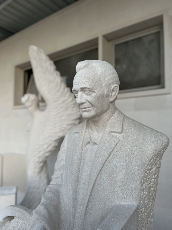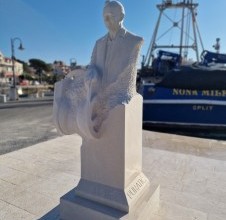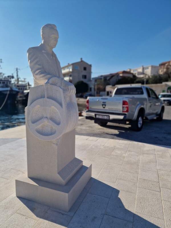 - among the recent works of our academic sculptor Lovre Jakšić, the monument to Mario Puratić stands out — the inventor of the famous fishing winch that fundamentally changed the way fishing vessels operate around the world. This portrait sculpture, installed in Sumartin — the inventor’s birthplace — was created from white Brač stone, further symbolising the connection between the island, its people, and tradition. The monument consists of a life-size figure representing Mario’s portrait in stone, shown in a standing pose, with one hand resting on the winch structure. His face was carefully modelled based on archival photographs, with a characteristic expression of gentleness and thoughtfulness — an important detail in the portrait-forming process. The other hand remains sketched — still “unshaped” from the stone — as a symbol of the inexhaustible value of his invention. The sculpture is crafted from a single block of stone, combining finely finished surfaces of the face and clothing with rustic, rough segments of the pedestal. This creates a visual contrast between the finished work and the raw material, emphasising both the sculptor’s hand and the message of a union between nature and technology. The location of the monument is especially meaningful — placed on the waterfront, with a view of the sea and fishing boats, many of which still use Puratić’s winch. In this way, the stone portrait of Mario gains an added dimension — it becomes a lasting monument in a public space, in dialogue with the environment and the community it belongs to. The Mario Puratić monument is another remarkable example of how a stone figure in a public space can carry a powerful message, while also showcasing the highest level of sculptural skill and respect for the person it represents.