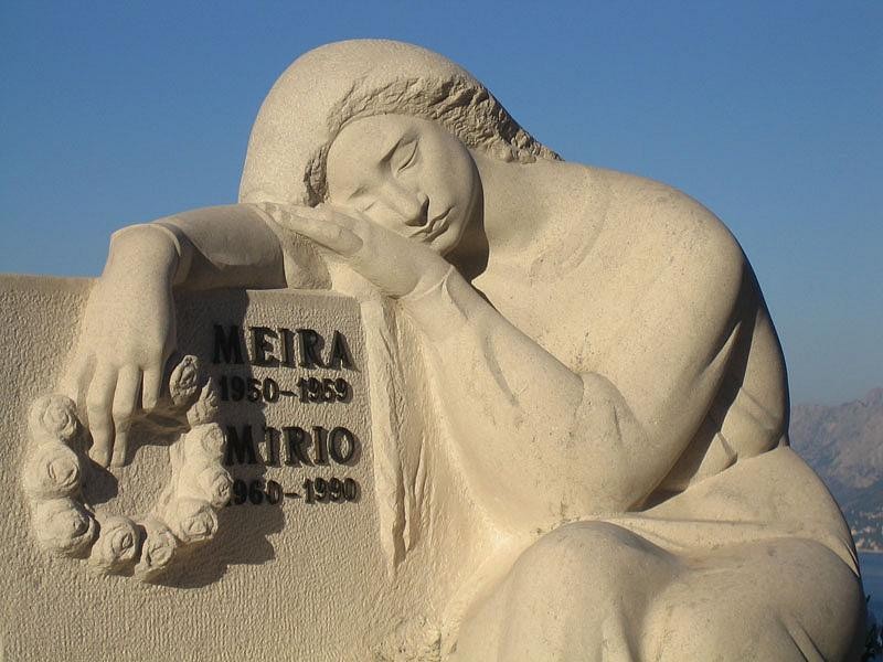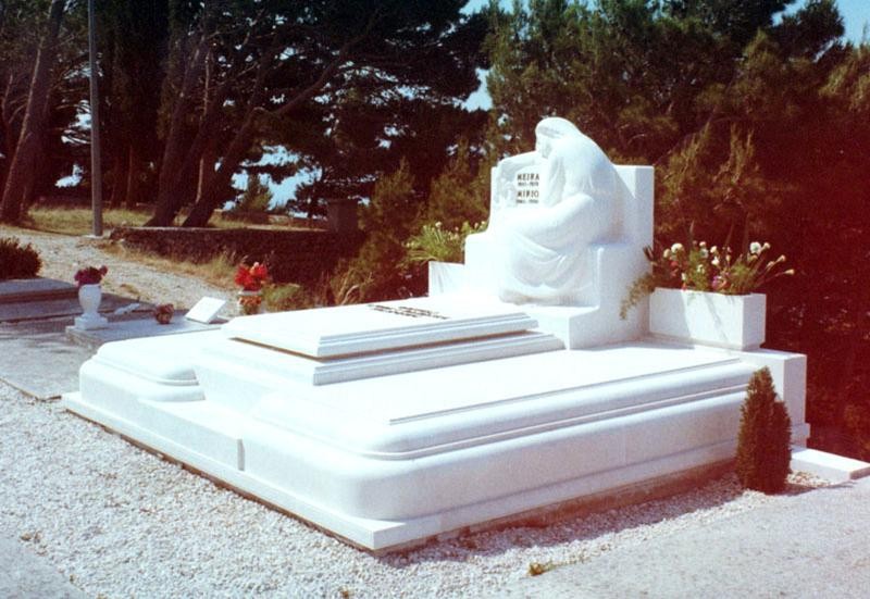 - ova grobnica izrađena od bijelog bračkog kamena primjer je iznimnog kiparskog i klesarskog umijeća, gdje se izrada grobnice i nadgrobnog spomenika spajaju u skladnu i dojmljivu cjelinu. Naizgled jednostavna u strukturi, ali bogata u detaljima, grobnica odiše monumentalnošću i profinjenom estetikom. Središnji motiv čini kamena figura djevojke naslonjene na nadgrobni spomenik. Njezina poza, blago pognute glave i ruke koja drži vijenac od cvijeća, simbolizira tugu, sjećanje i tišinu. Skulptura je izrađena s izuzetnim osjećajem za volumen i proporciju – u svakom pokretu i naboru kamene tkanine vidi se emocionalna težina i kiparska preciznost. Ova skulptura nastala je u suradnji s akademskim kiparom Venom Jerkovićem, čime je dodatno naglašena umjetnička vrijednost cijelog projekta. Cijela kompozicija temelji se na uravnoteženju oblih i ravnih linija. Dominantni, meki oblici daju grobnici osjećaj mira, dok čiste horizontalne plohe unose arhitektonsku jasnoću. U prednjem dijelu, pažnju privlače bogato profilirani rubovi, izvedeni u nekoliko razina. Ovi kameni profili, oblikovani s velikom pažnjom, dodatno naglašavaju eleganciju cjeline i svjetlosne prijelaze na površini kamena. Na obje strane figure smještene su dvije simetrične kamene vaze, koje uravnotežuju vertikalni ritam spomenika i doprinose osjećaju skladne simetrije. One nisu tek dekorativni element, već i važan dio arhitektonske kompozicije – cvijeće koje iz njih izrasta simbolizira život i neprekinutu vezu između prošlosti i sadašnjosti. Ova grobnica s kamenom figurom pokazuje kako se obrada kamena i suvremeni kiparski pristup mogu spojiti u trajno djelo umjetnosti. Svaki detalj – od profila do skulpture – odražava posvećenost materijalu, poštovanje prema tradiciji i duboku emotivnu dimenziju koja ovaj spomenik čini jedinstvenim.