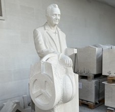 La figura in pietra presenta un ritratto realistico scolpito – Mario Puratić è raffigurato con la mano appoggiata sulla sua invenzione più celebre – il verricello di Puratić. La forma della scultura bilancia con attenzione figurazione e interpretazione moderna, fondendo arte, identità locale e patrimonio tecnico. Alla base si trova l’iscrizione MARIO PURATIĆ, chiaramente incisa nella pietra, e l’intero monumento è scolpito da un unico blocco di pietra bianca di Brač.