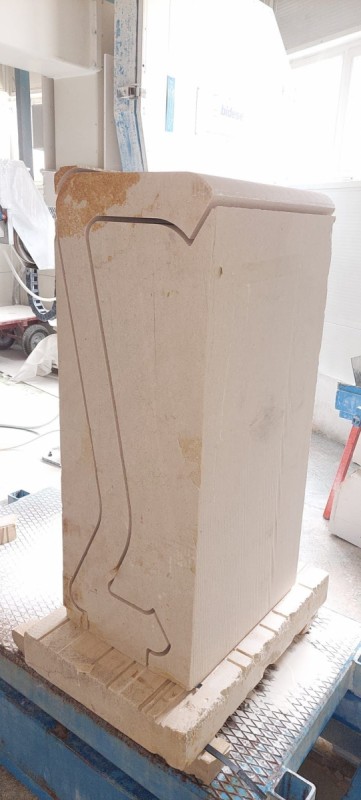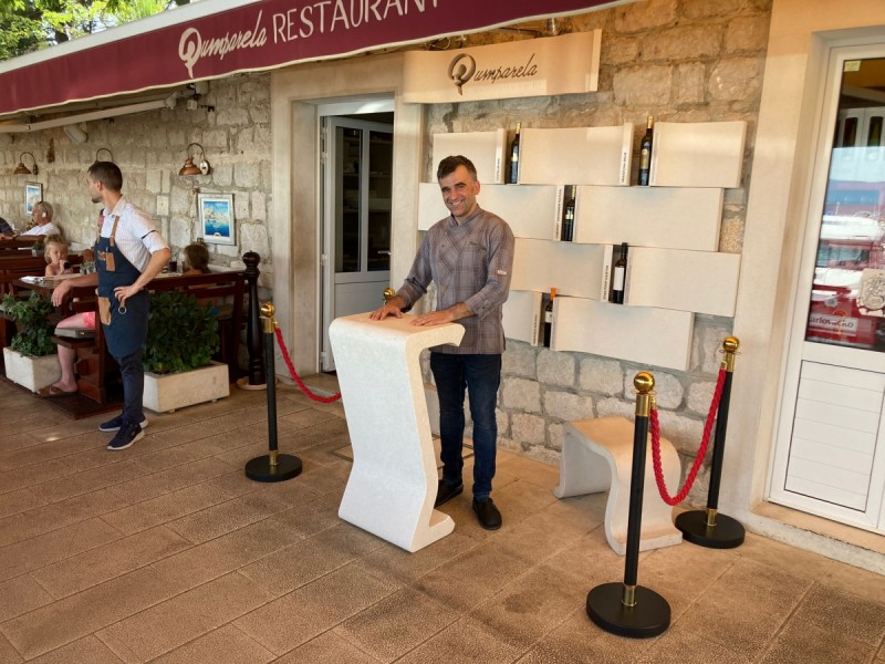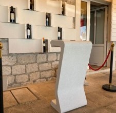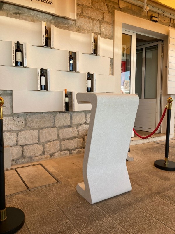 La realizzazione in pietra è opera del nostro laboratorio, mentre il design porta la firma di Dražen Jakšić e Dr. art. Dina Jakšić Pavasović. Oltre alla parete principale per la presentazione dei vini, è stato creato anche un banco scultoreo ricavato da un unico blocco di pietra di Brač. La sua forma fluida e piegata lo rende un elemento funzionale di grande impatto visivo per l’accoglienza degli ospiti. Completa l’insieme uno sgabello in pietra, coerente per forma e materiale con l’intero concept.