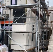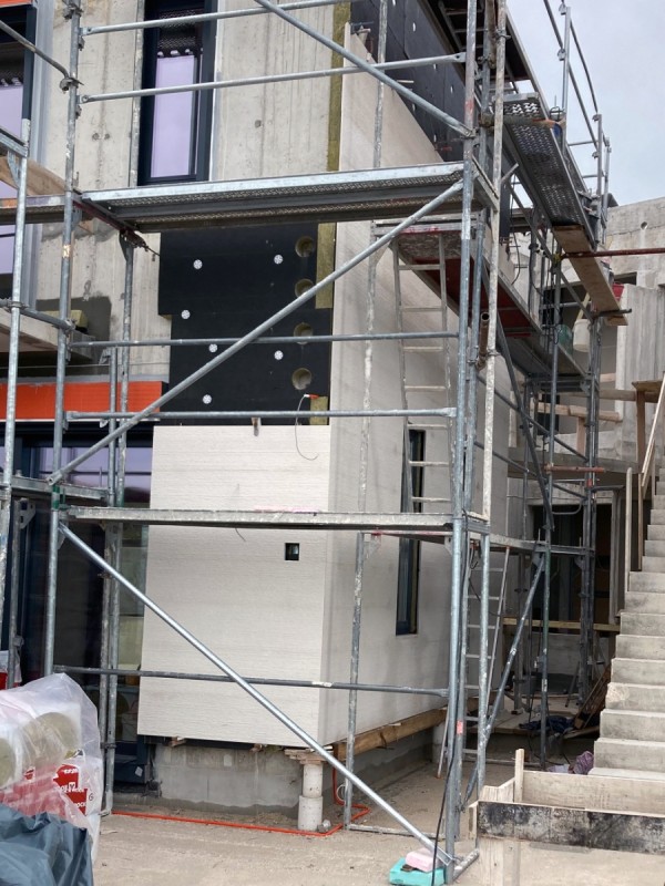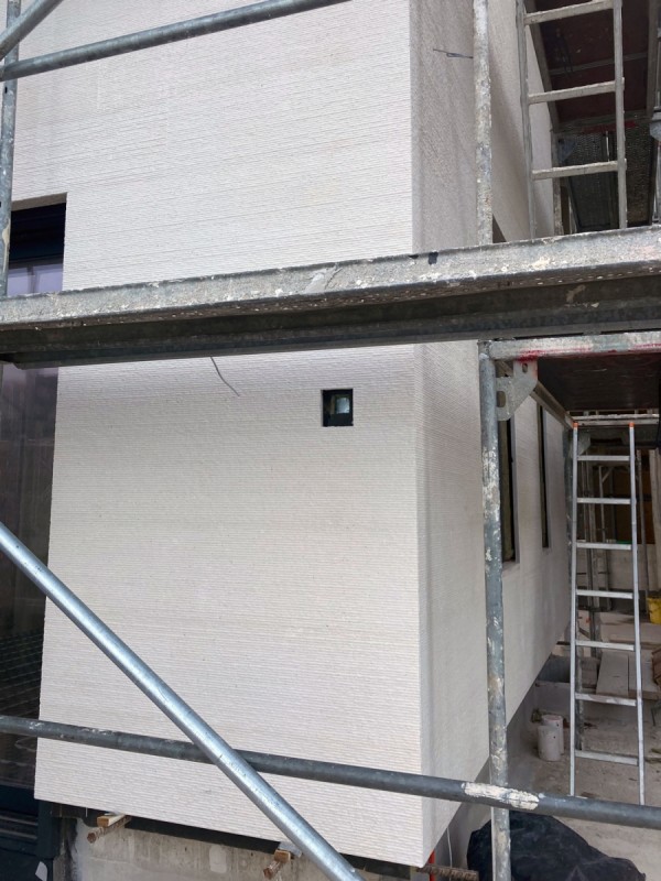 Siamo attualmente nella fase attiva dell’installazione, in cui ogni elemento in pietra viene posato con massima precisione. Questo tipo di facciata è particolarmente impegnativo a causa delle sue scanalature lineari. Il dettaglio più importante è la continuità delle linee, che devono proseguire senza interruzioni lungo tutta la superficie della facciata.