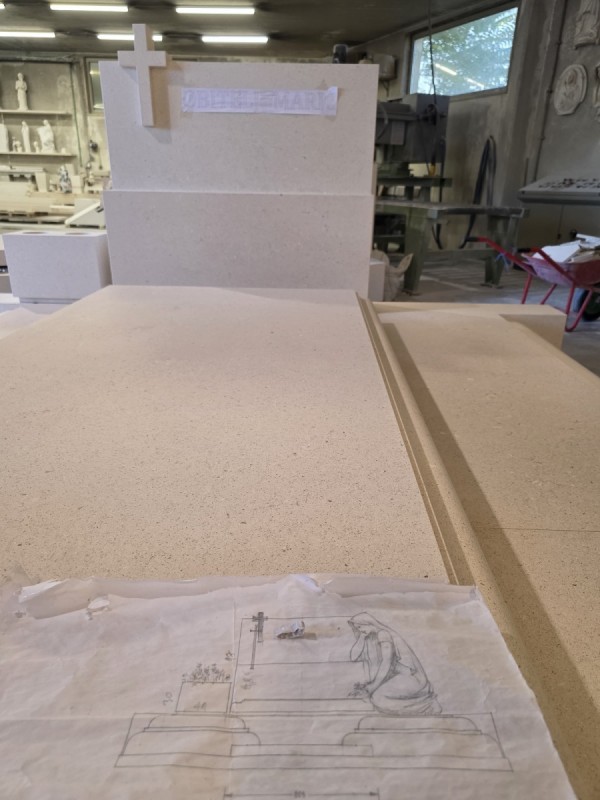 In una delle foto si vede il disegno della futura figura in pietra, che sarà l’elemento principale della tomba. La figura completerà la composizione e le conferirà un carattere artistico unico. Progetti come questo richiedono esperienza, pazienza e rispetto per la pietra – un materiale che risponde solo a mani esperte e gesti precisi.