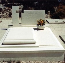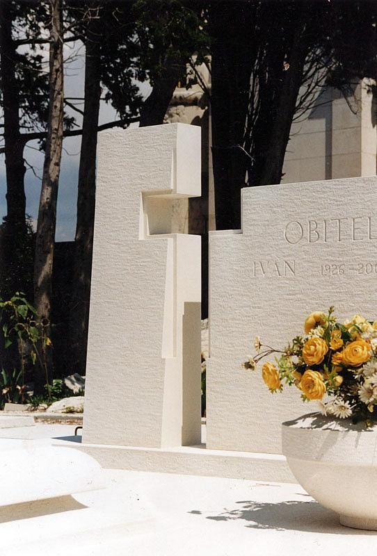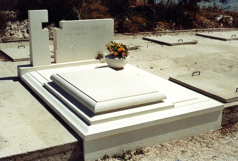 - la tomba della famiglia Kurtić, realizzata in pietra bianca di Brazza, rappresenta un equilibrio perfetto tra artigianato tradizionale e design contemporaneo. Pur essendo di piccole dimensioni, si distingue per la purezza delle linee e l’eleganza delle proporzioni. L’elemento principale è la lapide composta da due blocchi di pietra, tra i quali si apre uno spazio che forma una croce. Questa interpretazione moderna e minimale del simbolo sacro dona alla tomba una forte presenza spirituale. La croce appare incompleta nella forma, ma immediatamente riconoscibile, suggerendo profondità e significato attraverso la semplicità. La superficie della pietra è bocciardata finemente, conferendo un aspetto opaco e naturale che valorizza la luminosità della pietra di Brazza. L’intera composizione è leggermente asimmetrica, ma perfettamente bilanciata grazie alle proporzioni studiate e al dialogo tra le masse. Una coppa in pietra tornita, dal profilo morbido e armonioso, introduce un elemento di contrasto rispetto alle linee geometriche del monumento. Questo dettaglio, realizzato con tecnica di tornitura della pietra, aggiunge un tocco di eleganza e completezza visiva. La tomba della famiglia Kurtić è un raffinato esempio di design moderno per monumenti funebri, dove arte, simbolismo e maestria artigianale si fondono in un’unica espressione di serenità e bellezza senza tempo.